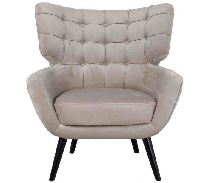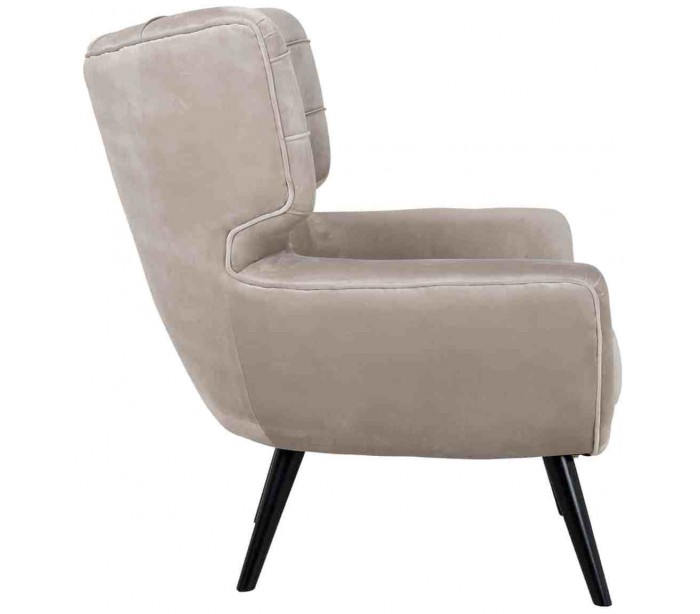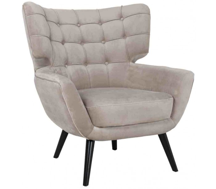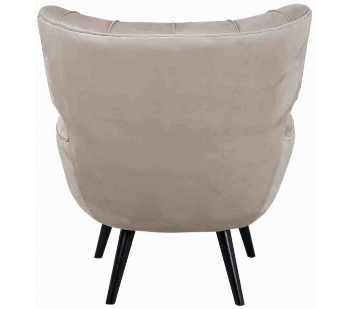 Lænestol i et design fra hollandske Richmond Interiors. Lænestolen er fremstillet i khakifarvet velour og med ben i sortlakeret træ. Stolen måler 94 cm i højden over ryggen og 85 x 85 cm i bredde og dybde.