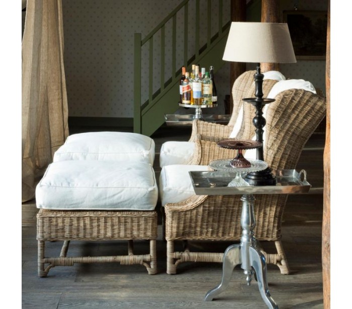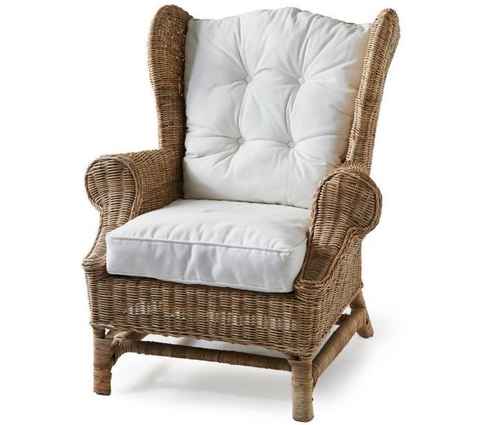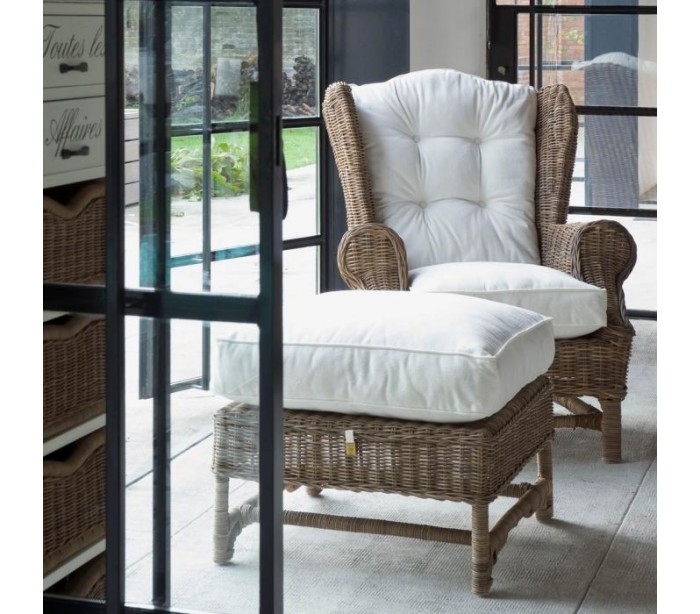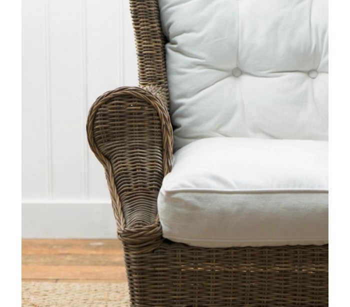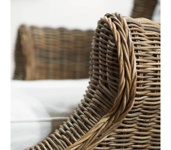 Riviera Maison lænestol i et design af grånuanceret rattan og med hynder i hvid polyester. Lænestolen måler 102 cm i højden over ryggen og 67 cm i bredden.