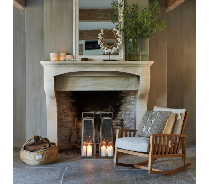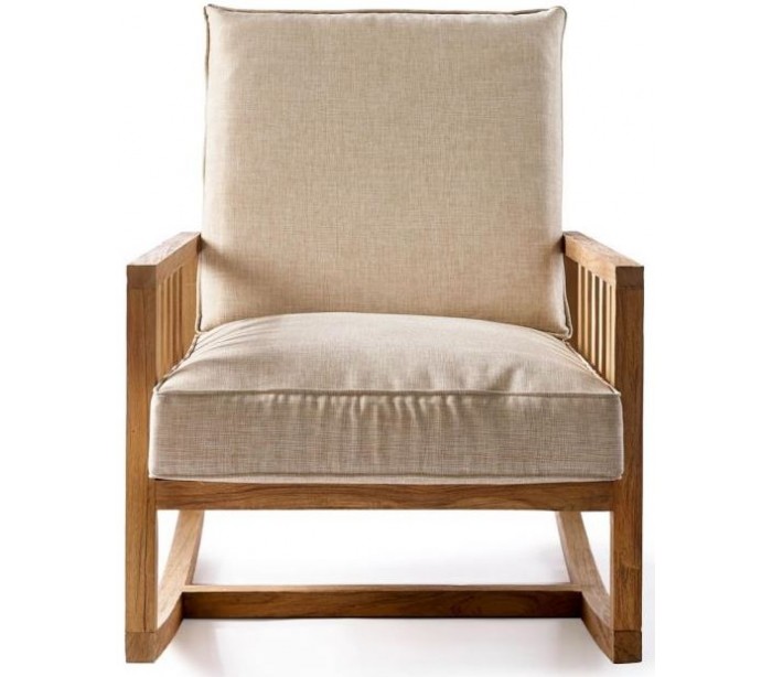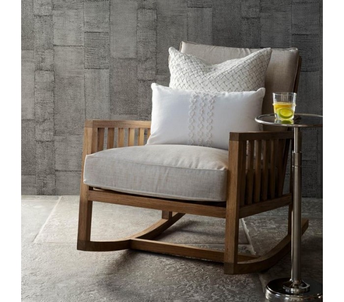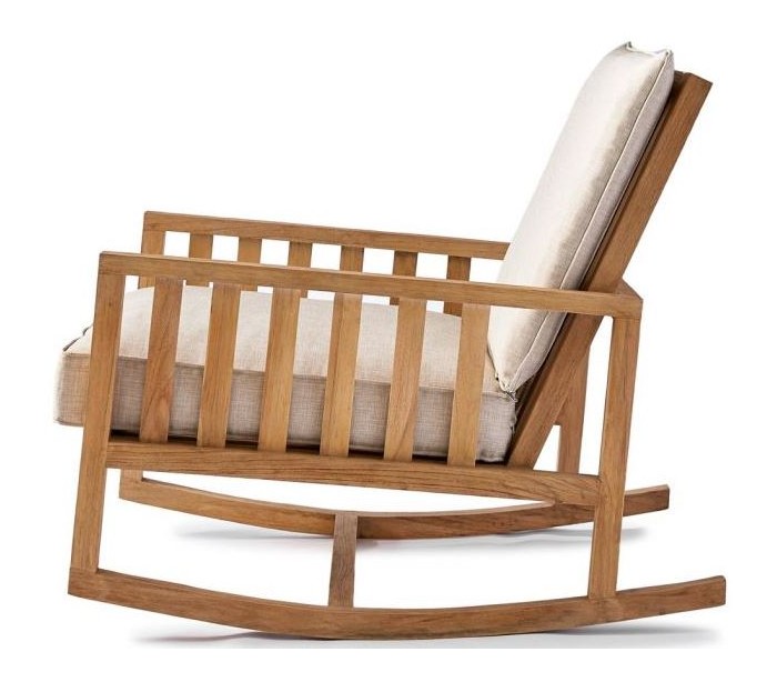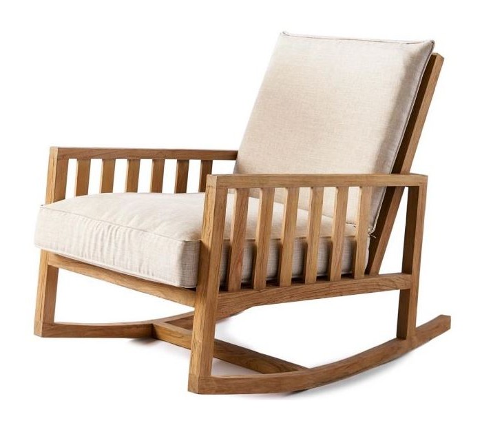 Riviera Maison gynge lænestol i et design af naturfarvet teaktræ og med hynder i sandfarvet bomuld. Stolen måler 77 cm i højden over ryggen og 63 cm i bredden.