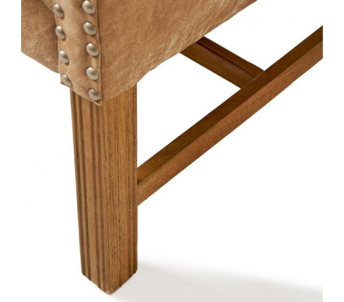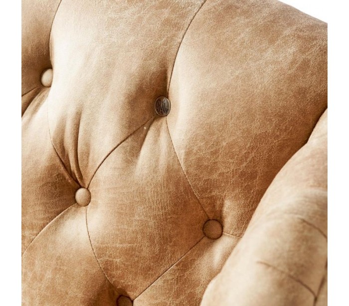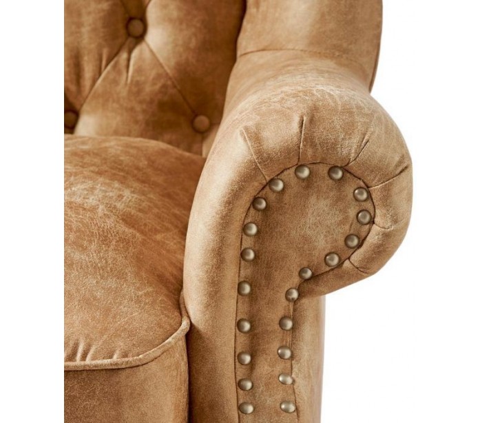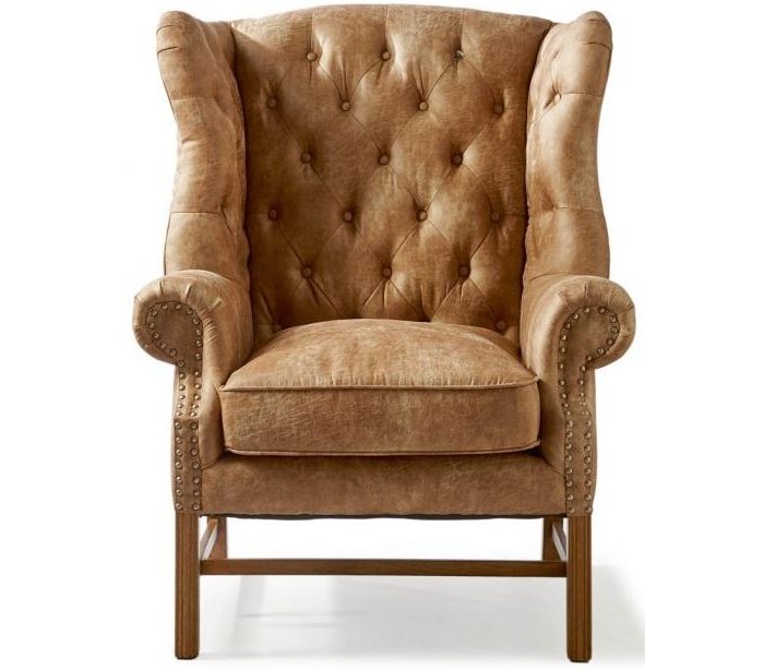Riviera Maison lænestol i et moderne design af camel farvet pellini læder og brunlakeret træ. Stolen måler 113 cm i højden over ryggen og 95 cm i bredden. Detajle med knap med logo på front, og nitter på side og bagside.