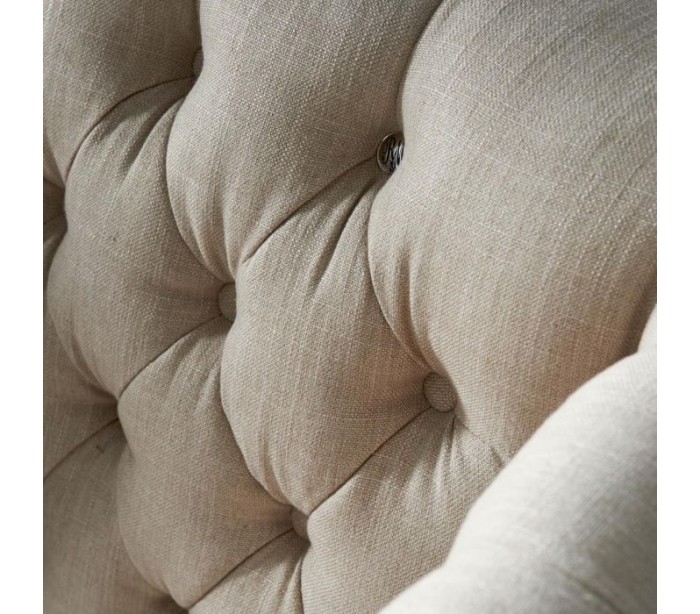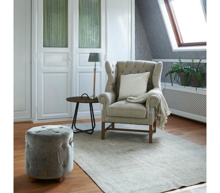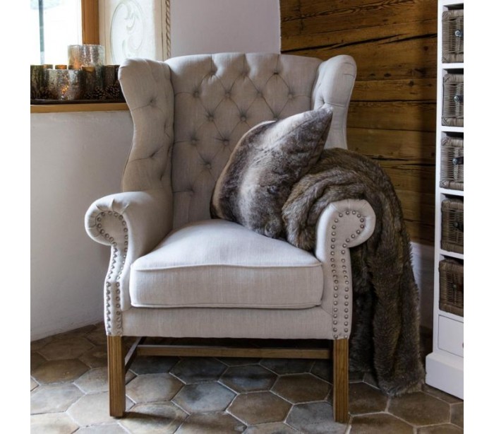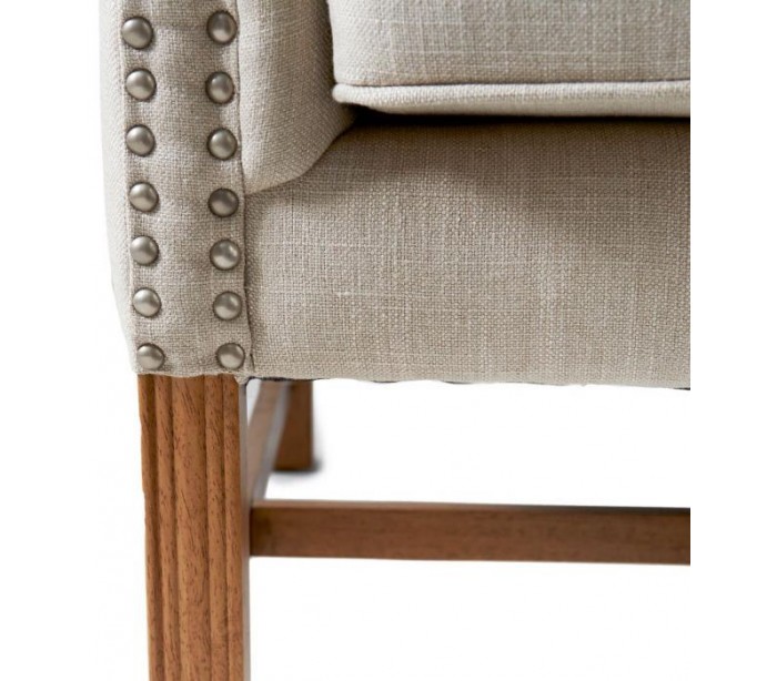 Riviera Maison lænestol i et moderne design af beige linned og brunlakeret træ. Stolen måler 113 cm i højden over ryggen og 95 cm i bredden. Detajle med knap med logo på front, og nitter på side og bagside.