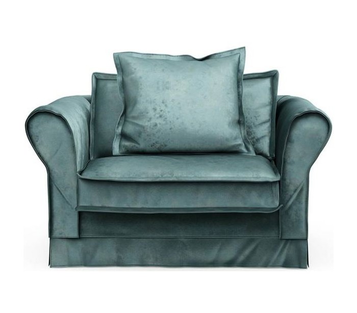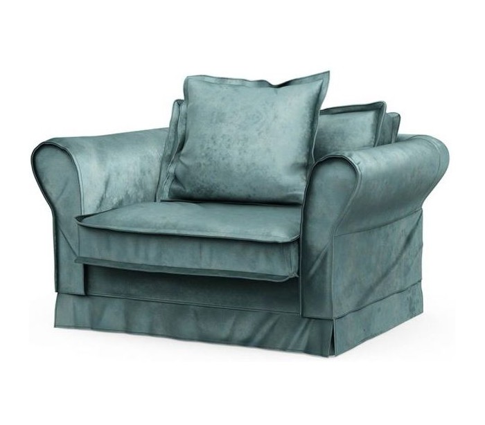 Riviera Maison lænestol i et luksuriøst design af mineral blå velour. Stolen måler 79 cm i højden over ryggen og 120 cm i bredden.