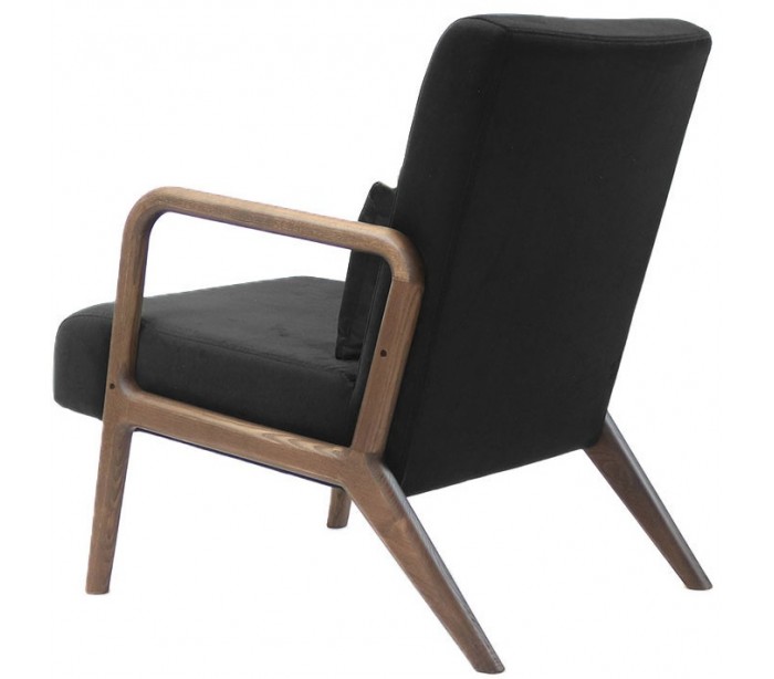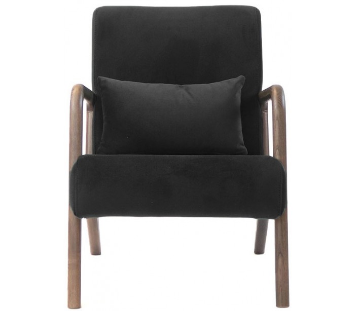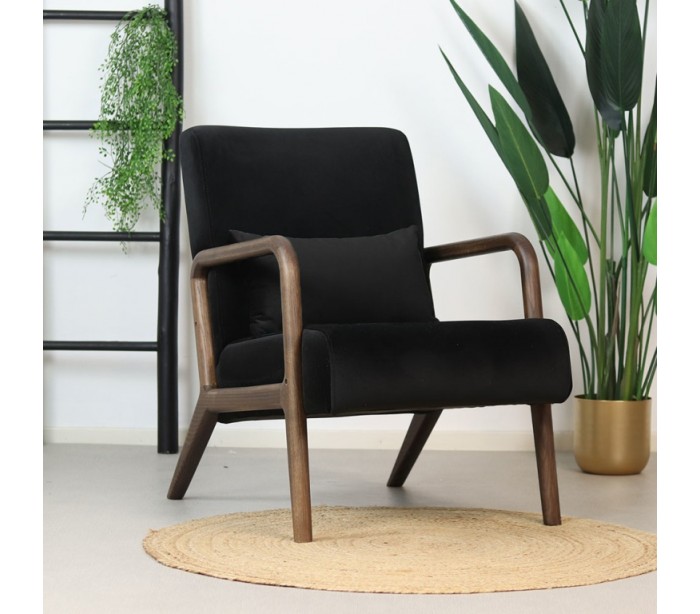 Bibi lænestol i et design af sort velour og med stel i mørkebrun bejset træ. Stolen måler 78 cm i højden over ryggen og med siddehøjde på 35 cm. Velouren er vandafvisende og med martindale på 100.000, som gør stolen særligt anvendelig i restaurationer med flere. Pyntepude medfølger.