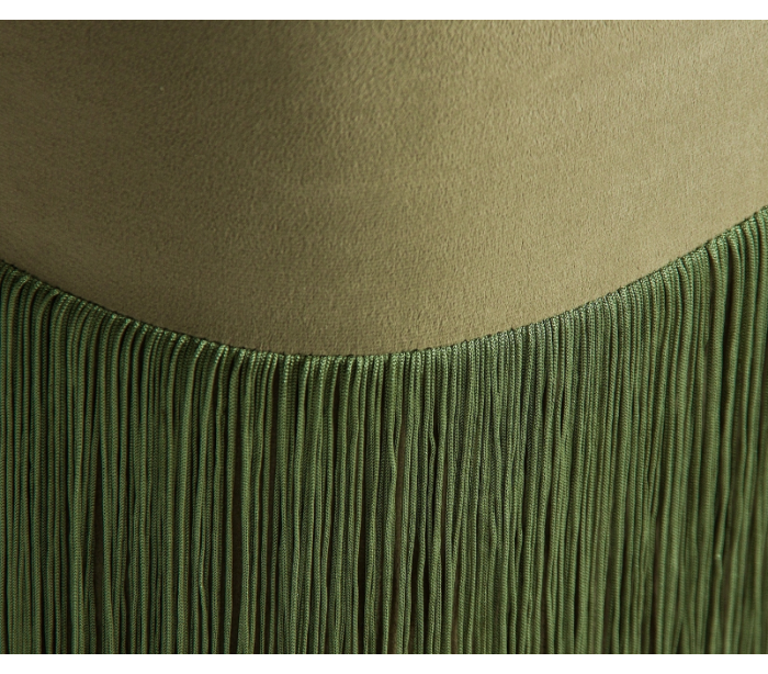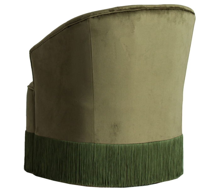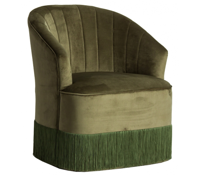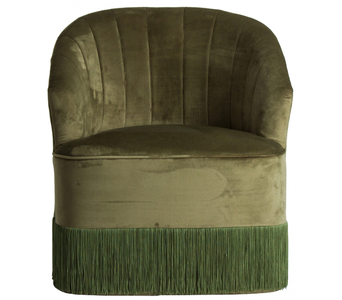 Lænestol i et hyggeligt design, i bedsteforældre stil, udført i mørkegrøn velour og med frynser. Lænestolen måler 80 cm i højden over ryggen og 66 x 69 cm i bredde og dybde.