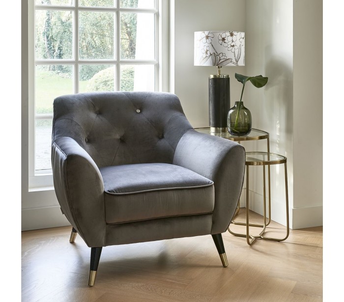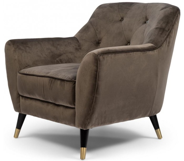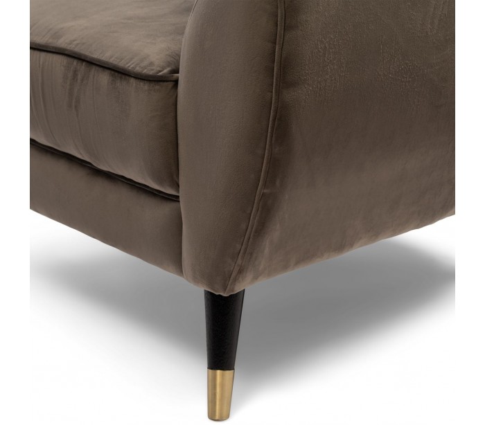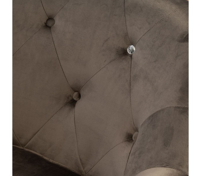 Riviera Maison lænestol i et luksuriøst design af antracit velour og sortlakeret træ med detaljer i messing. Stolen måler 79 cm i højden over ryggen og 89 cm i bredden. Bemærk detaljeknappen med Riviera Maison logo.