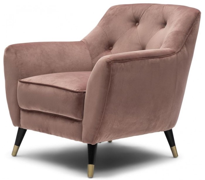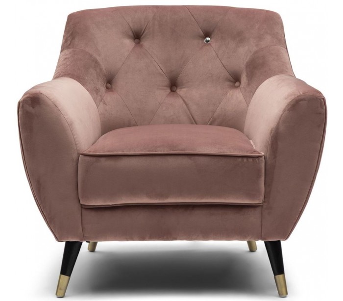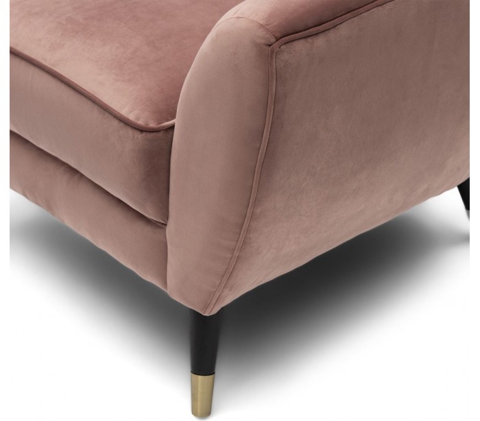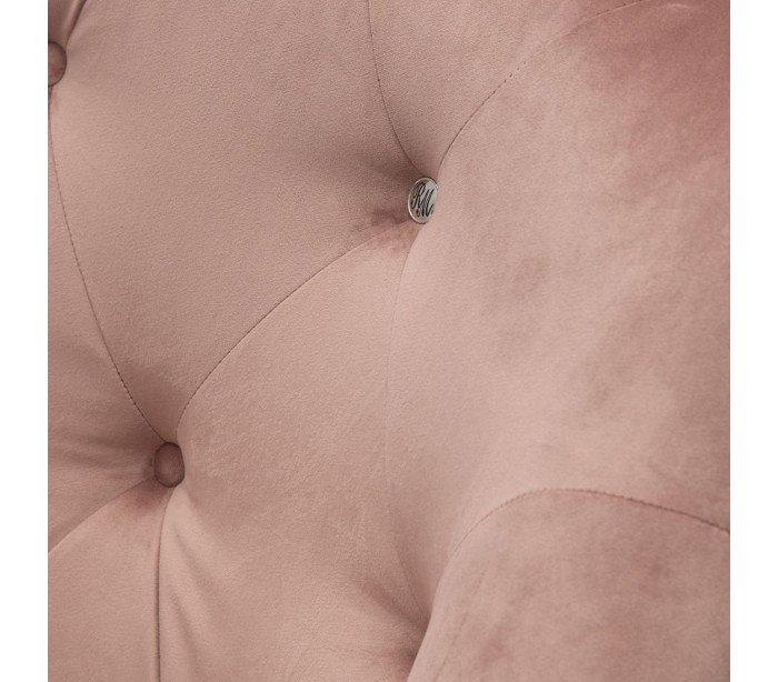 Riviera Maison lænestol i et luksuriøst design af rosa velour og sortlakeret træ med detaljer i messing. Stolen måler 79 cm i højden over ryggen og 89 cm i bredden. Bemærk detaljeknappen med Riviera Maison logo.
