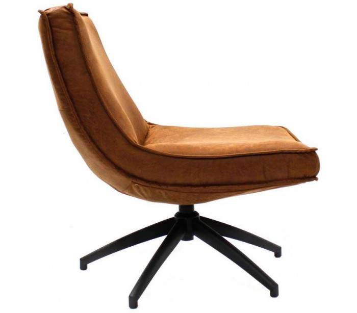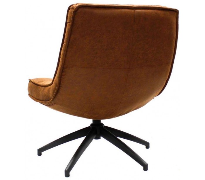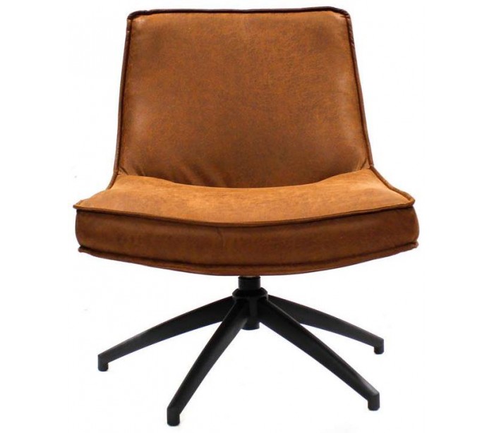 Loungestol i et industrielt design, fremstillet med sæde i vintage cognacfarvet økolæder (70% læder/30% polyester) og stel i sortlakeret metal. Stolen måler 80 cm i højden over ryggen og med siddehøjde på 42 cm.