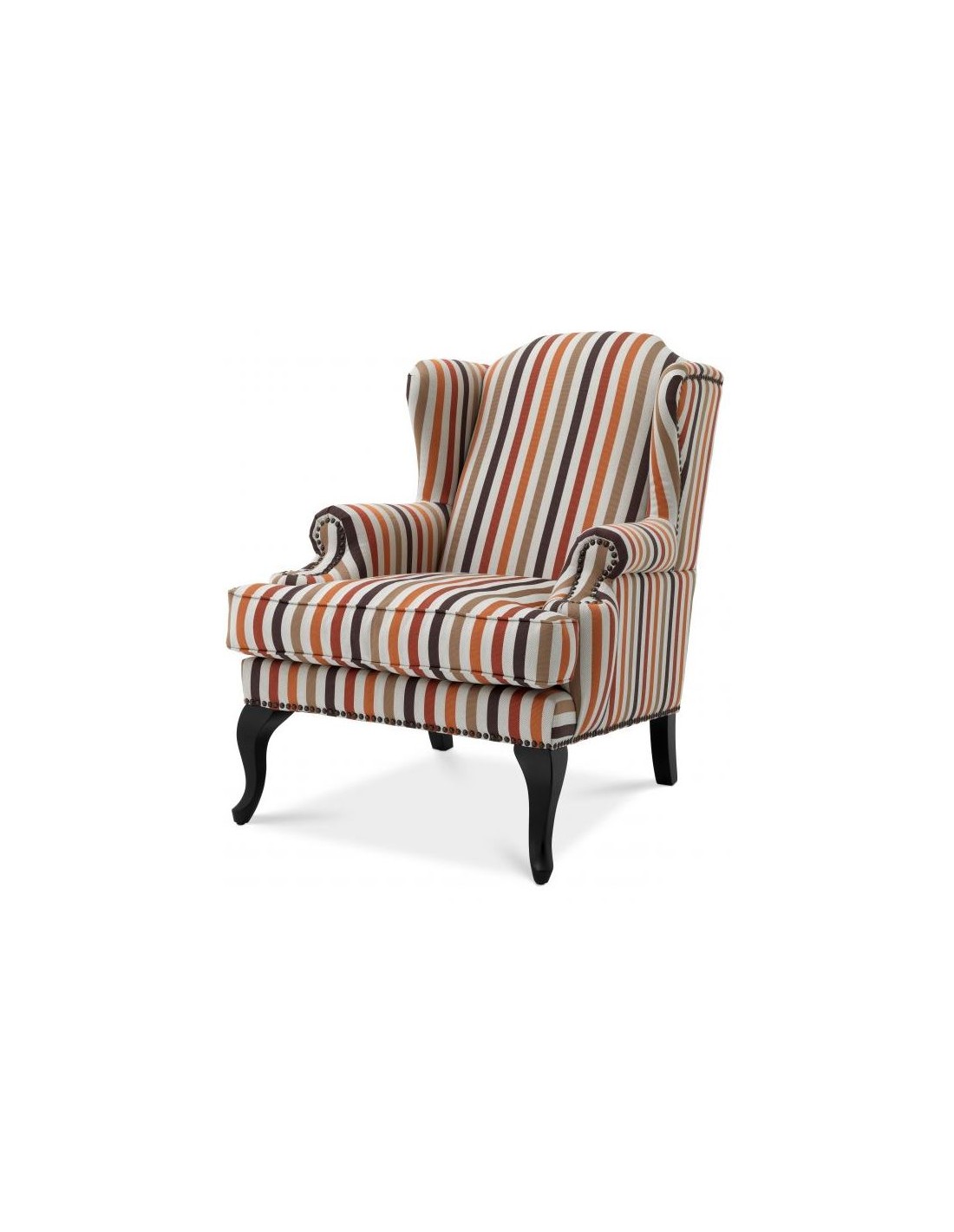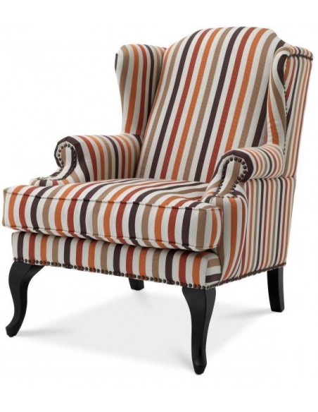 Eichholtz Frank Sinatra lænestol udført i et design af stribet polyester med nitter og sortlakeret træ. Lænestolen måler 104 cm i højden over ryggen og 81 x 104 cm i bredde og dybde. Siddehøjden er 54 cm.