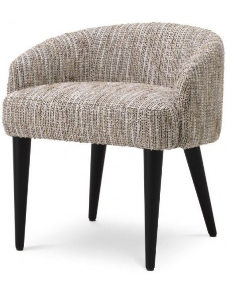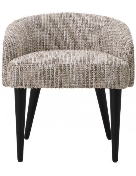 Eichholtz Rizzo stol udført i et design af beige polyester (97%) og viskose (3%) og med ben i sortlakeret træ. Stolen måler 64 cm i højden over ryggen og 61 x 56 cm i bredde og dybde. Siddehøjden er 48 cm. En perfekt stol til soveværelset, sminkebordet eller entréen.