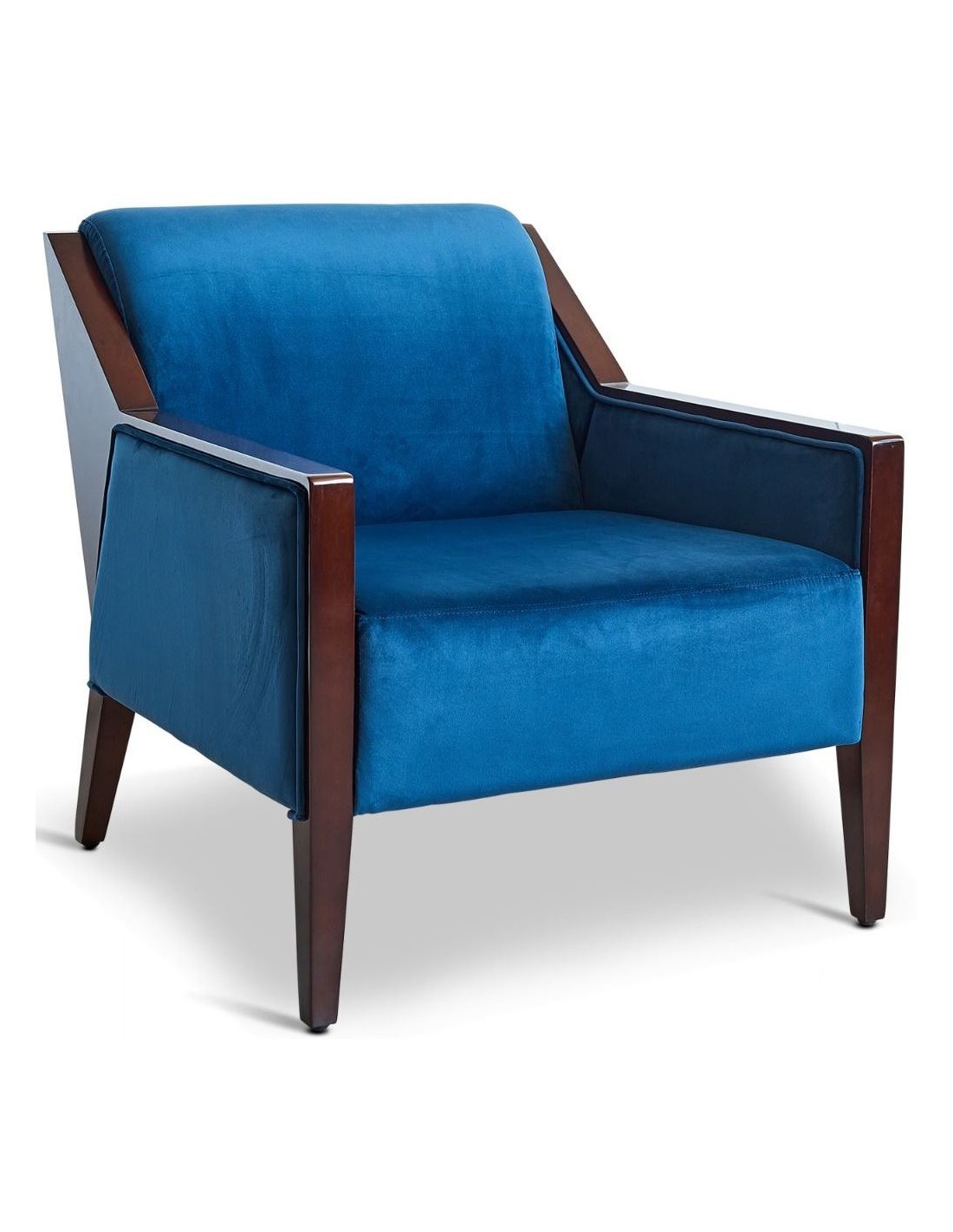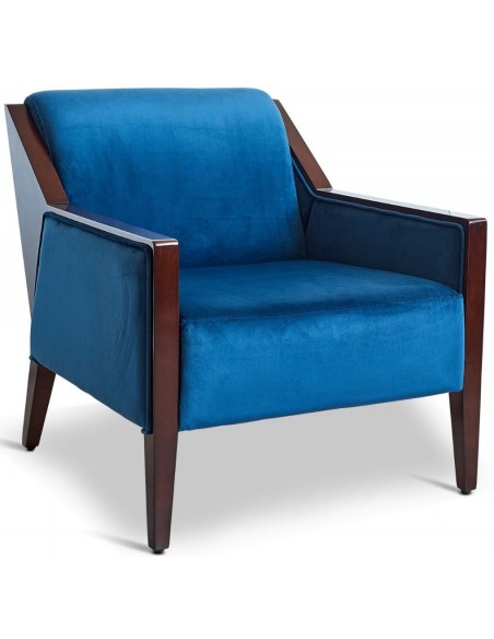 Lænestol fra Authentic Models. Lænestolen er udført i et design i vintage mørkebrun lakeret mahognitræ og blå velour. Stolen måler 77 cm i højden og 75 x 75 cm i bredde og dybde.