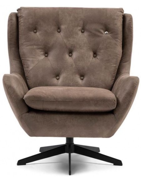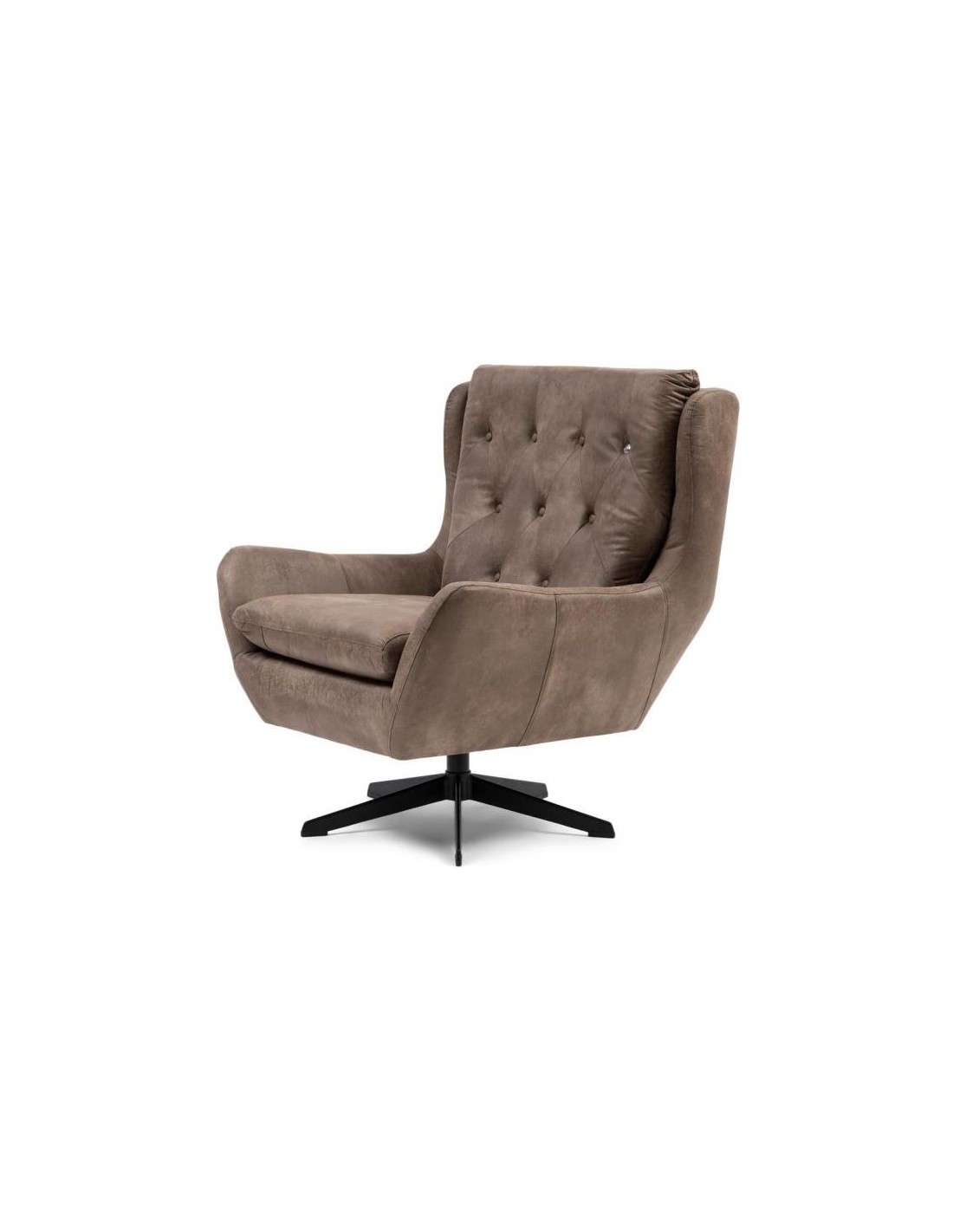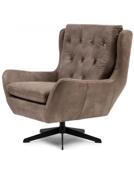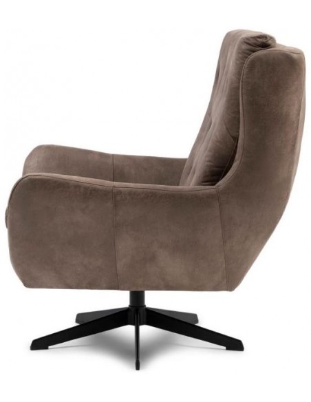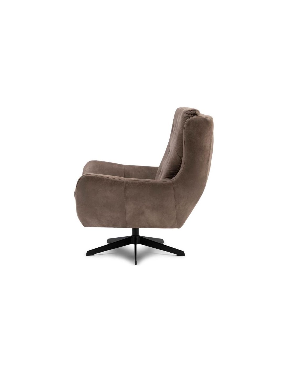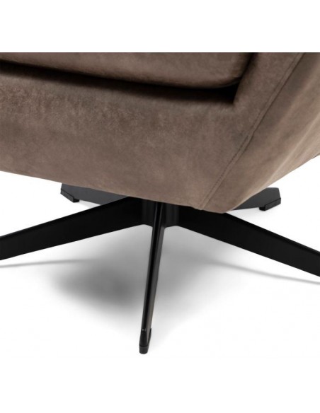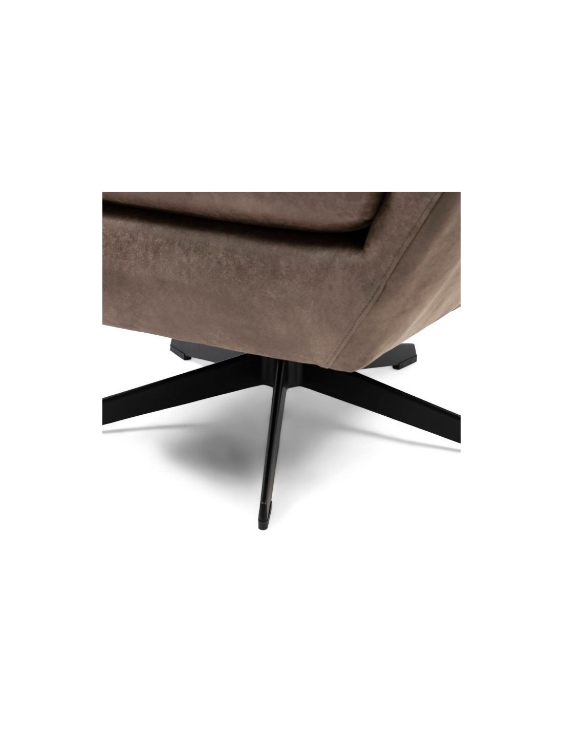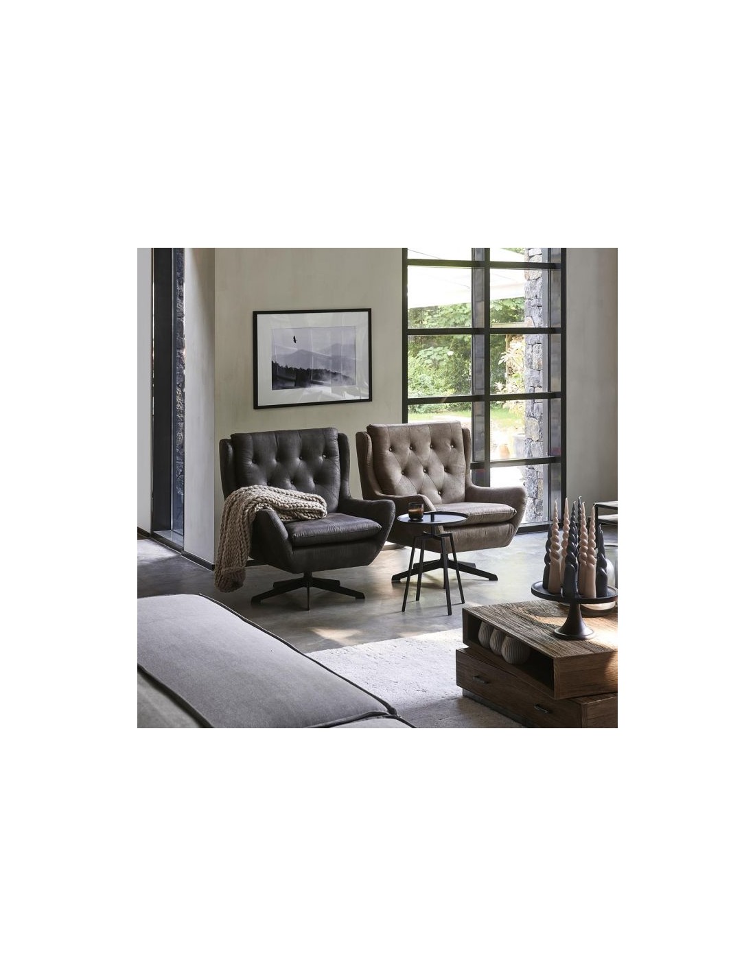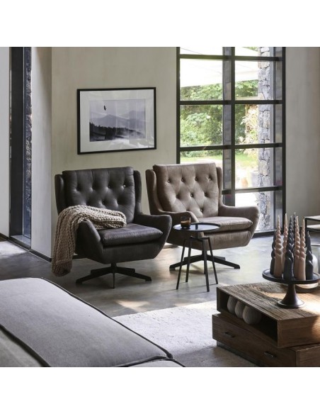 Riviera Maison rotérbar lænestol udført i et design af kaffefarvet pellini læder og med stel i sortlakeret metal. Stolen måler 94 cm i højden over ryggen og 82 cm i bredden.