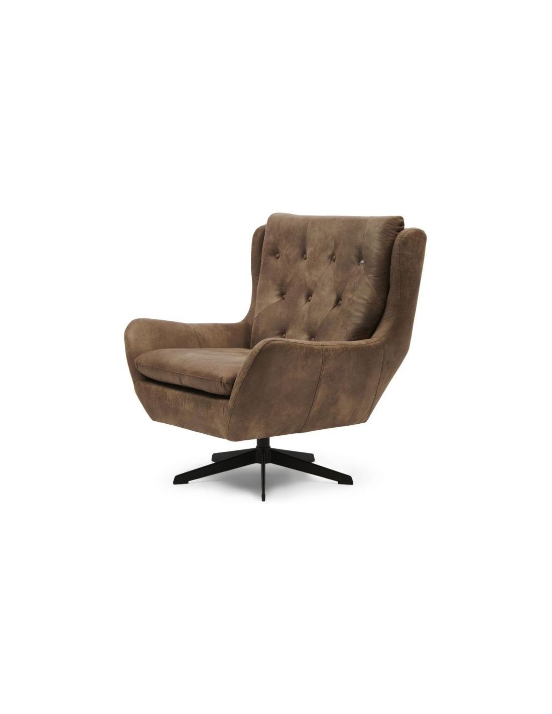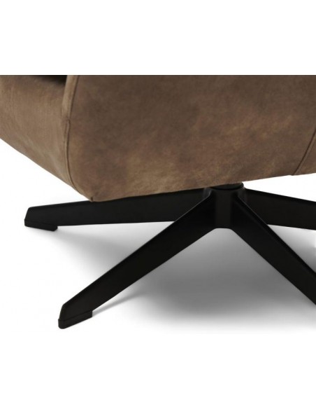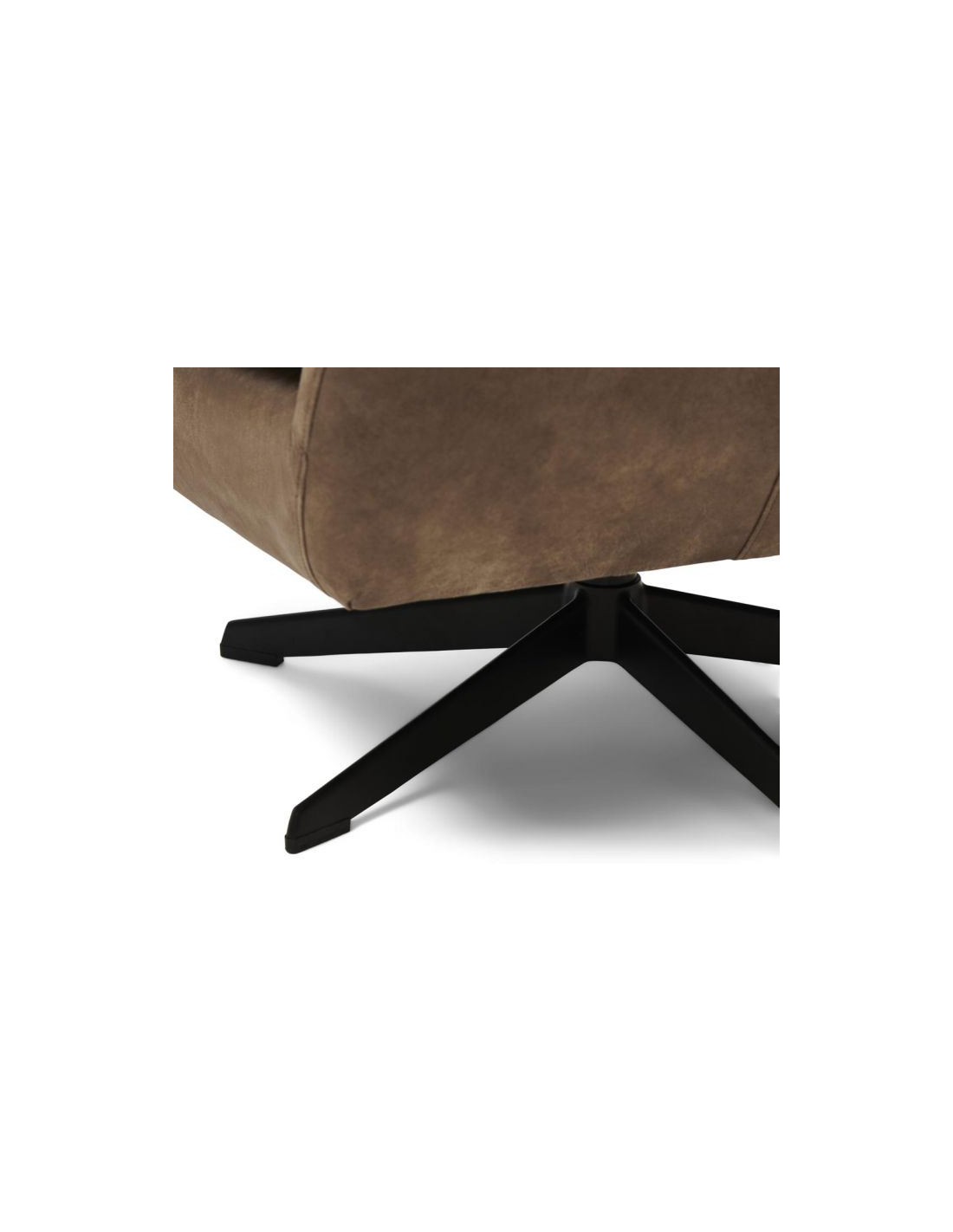 Riviera Maison rotérbar lænestol udført i et design af kamelbrun pellini læder og med stel i sortlakeret metal. Stolen måler 94 cm i højden over ryggen og 82 cm i bredden.