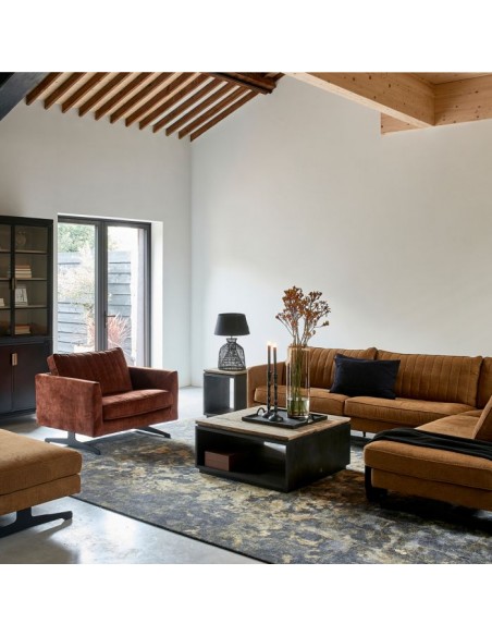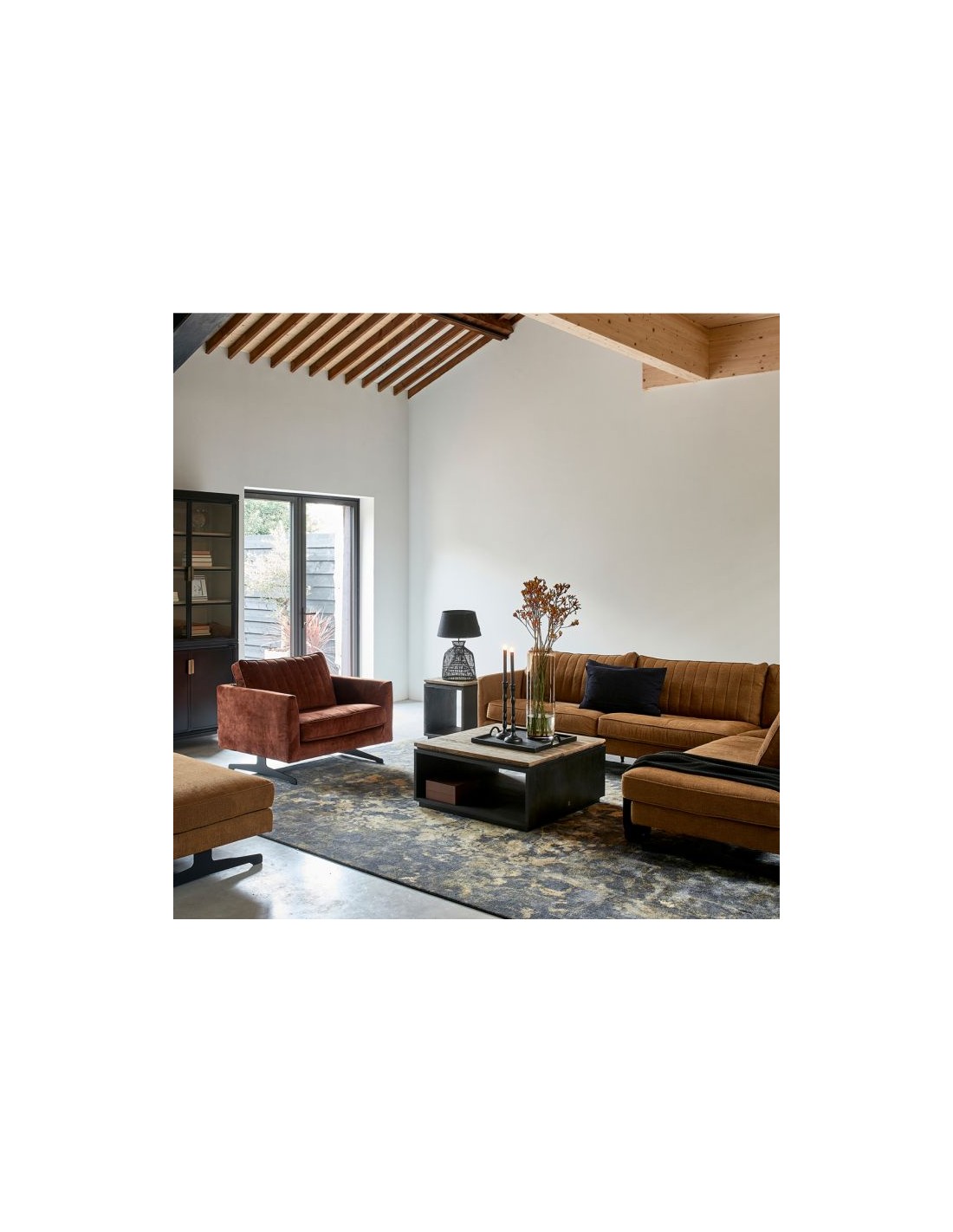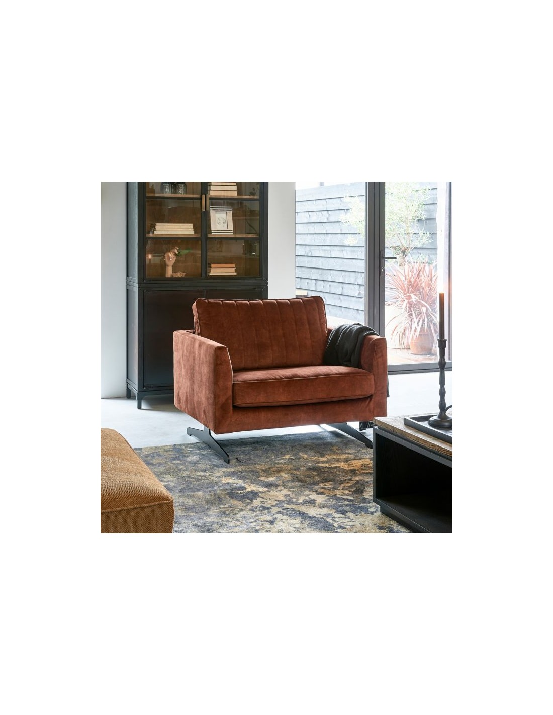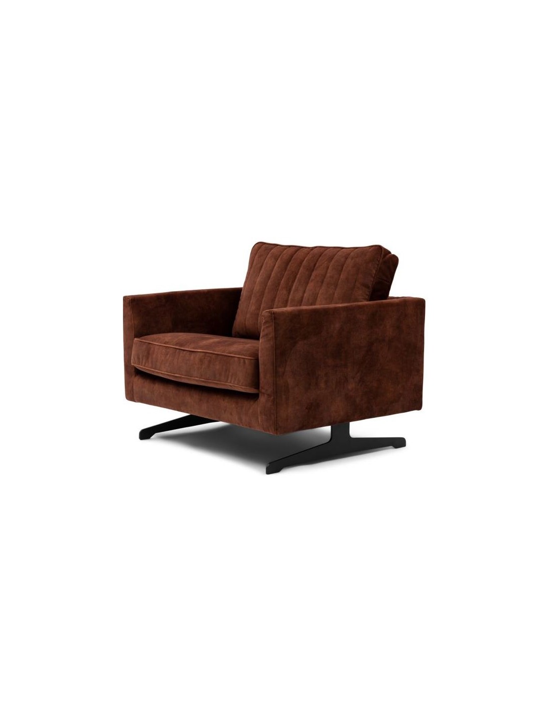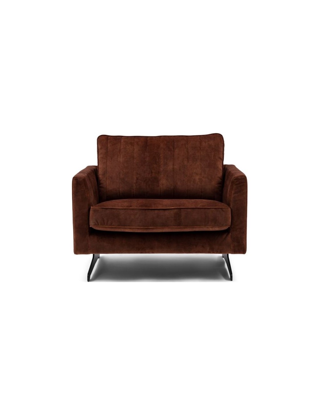 Riviera Maison lænestol, udført i et luksuriøst design af kastanjefarvet velour og stel i sortlakeret jern. Stolen måler 85 cm i højden over ryggen og 105 x 86 cm i bredde og dybde.