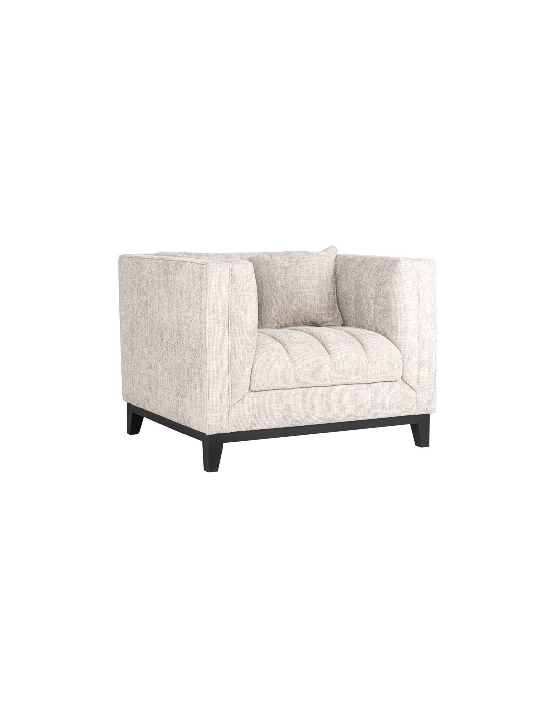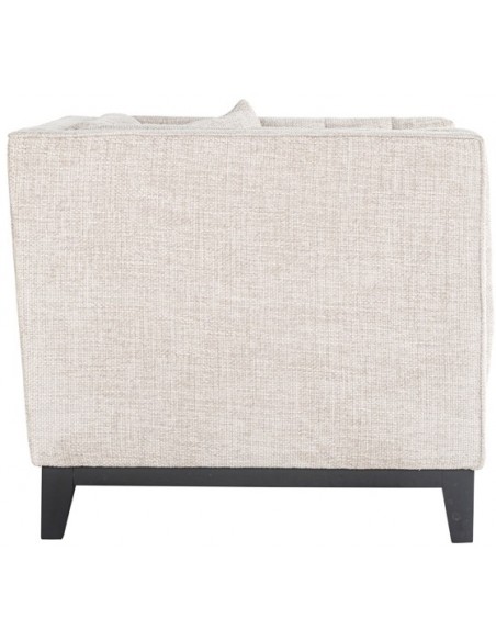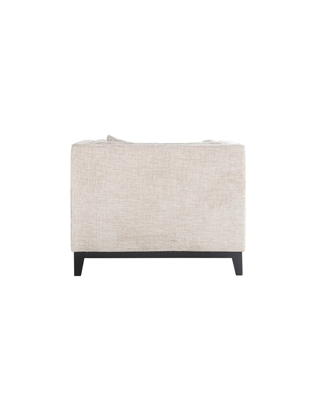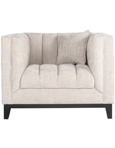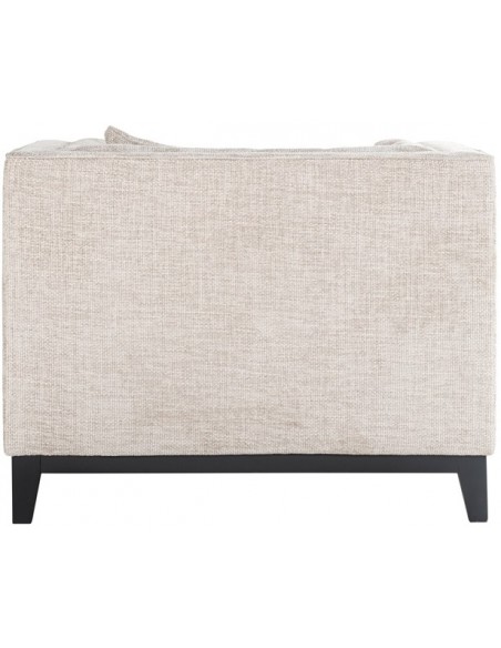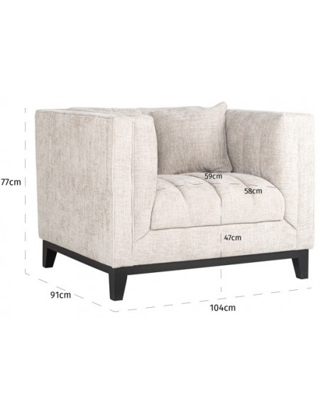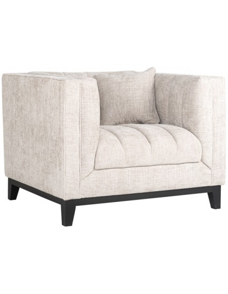 Lænestol i et design fra hollandske Richmond Interiors, udført i naturfarvet polyester og med ben i sortlakeret træ. Lænestolen måler 77 cm i højden over ryggen og 104 x 91 cm i bredde og dybde.