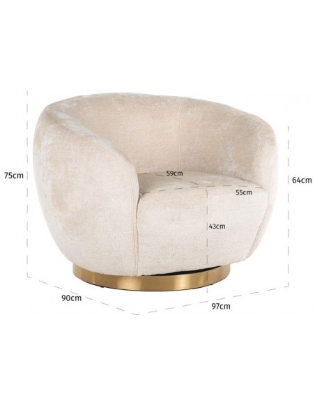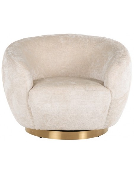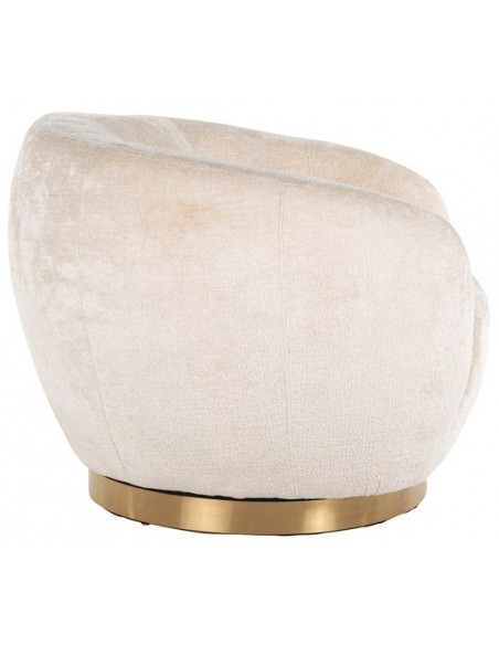 Lænestol i et design fra hollandske Richmond Interiors. Stolen er fremstillet i messinglakeret stål og hvid chenille polyester. Stolen måler 75 cm i højden over ryggen og med en siddehøjde på 43 cm og er rotérbar i stellet.