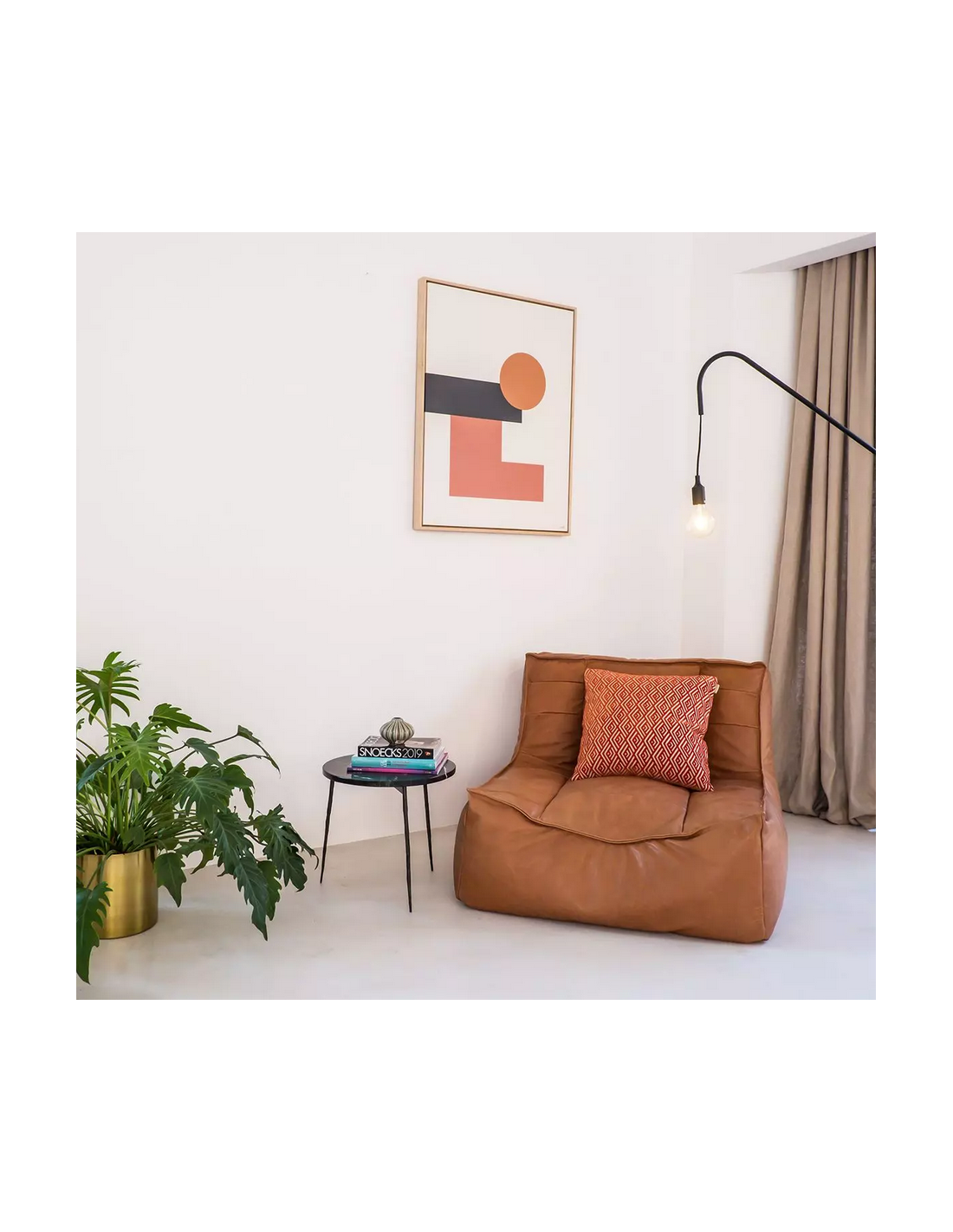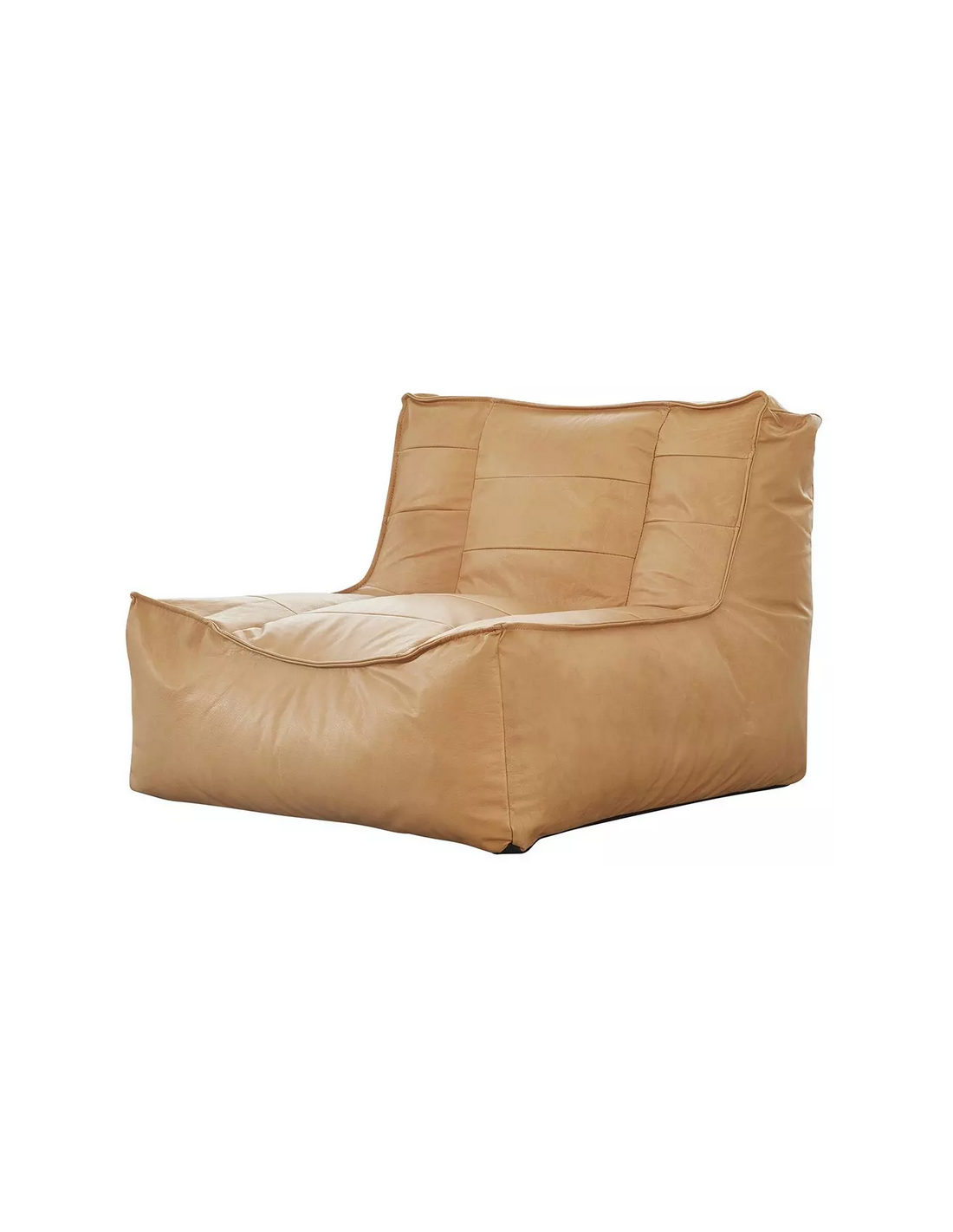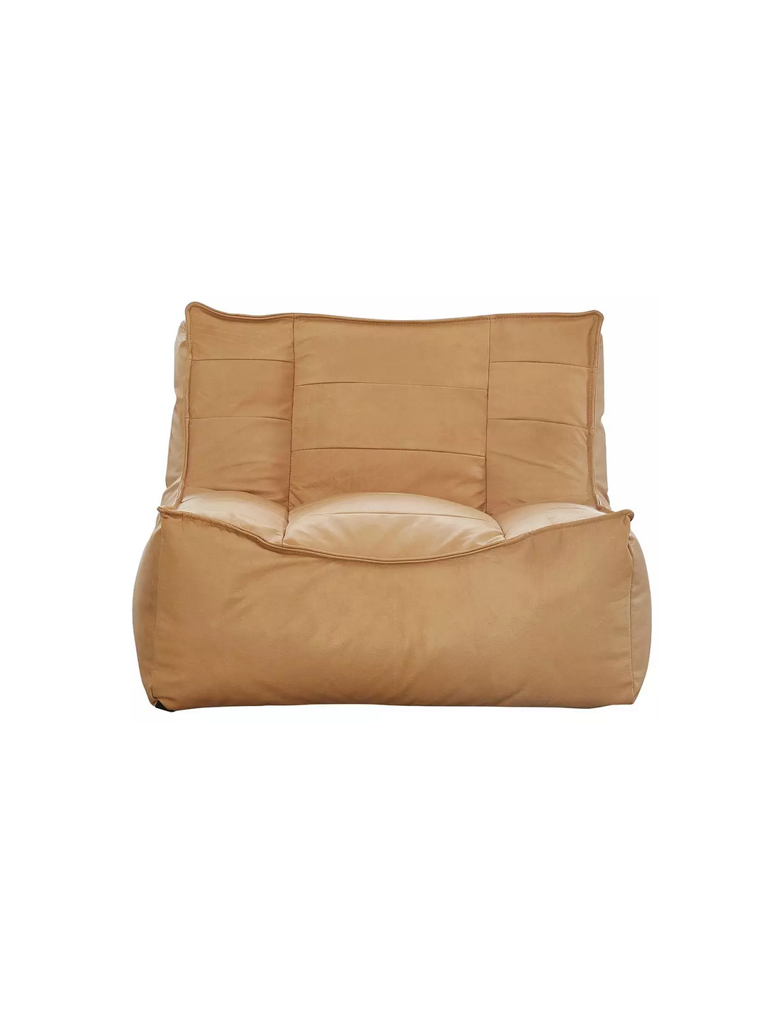 Loungestol udført i et moderne design af vintage cognac farvet læder. Stolen måler 75 cm i højden og 105 x 85 cm i bredde og dybde. Stolen har komfort som en sækkestol.