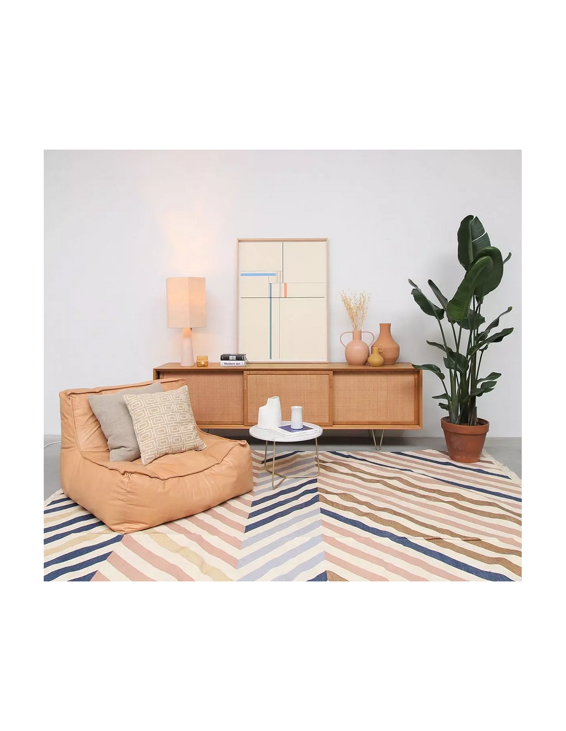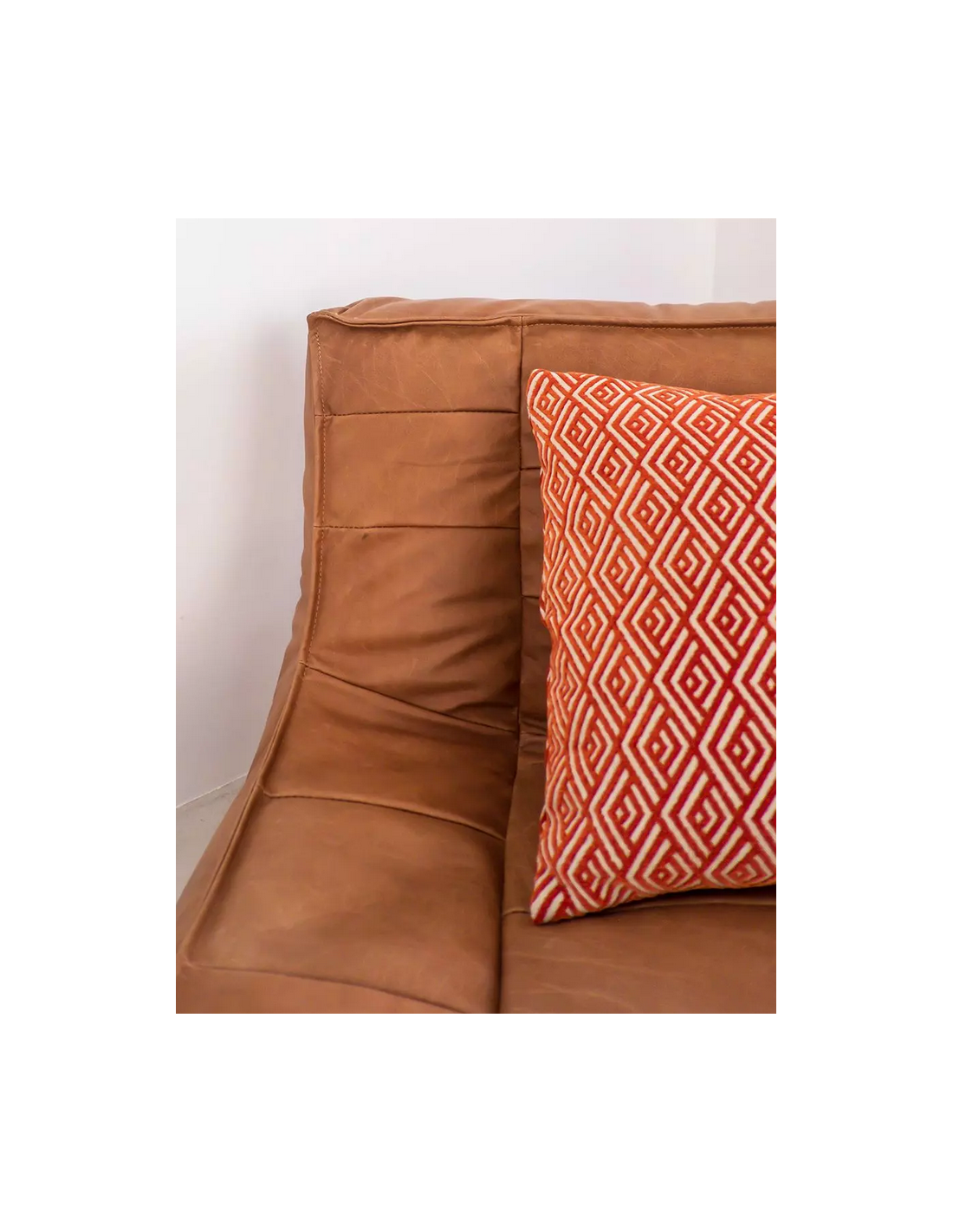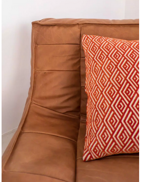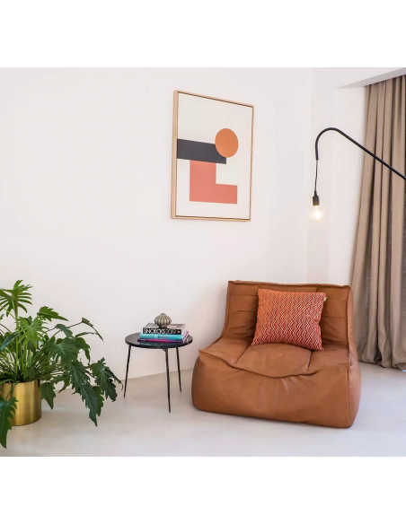 Loungestol udført i et moderne design af vintage cognac farvet læder. Stolen måler 75 cm i højden og 105 x 85 cm i bredde og dybde. Stolen har komfort som en sækkestol.