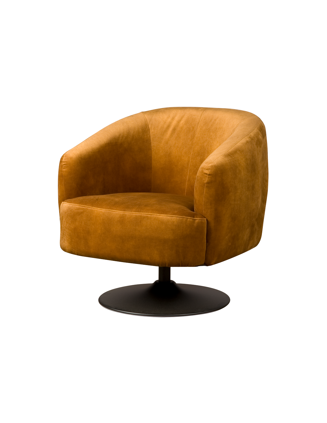 Lænestol udført i et design af gyldent polyester og med rotérbart stel i sortlakeret metal. Stolen måler 75 cm i højden over ryggen og 77 cm i bredden og er polstret med højkvalitets skum.