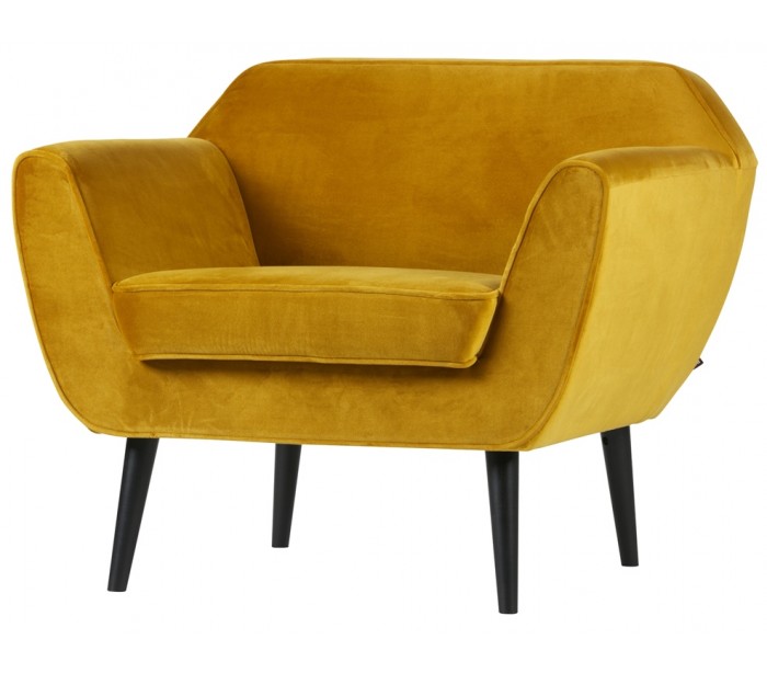Moderne lænestol i et flot design af okkerfarvet 100% velour. Lænestolen måler 92 cm i bredden og er polstret med højkvalitets skum.