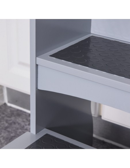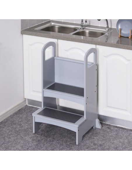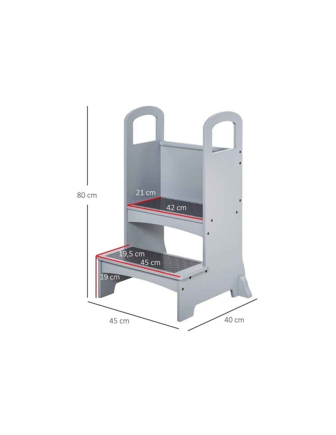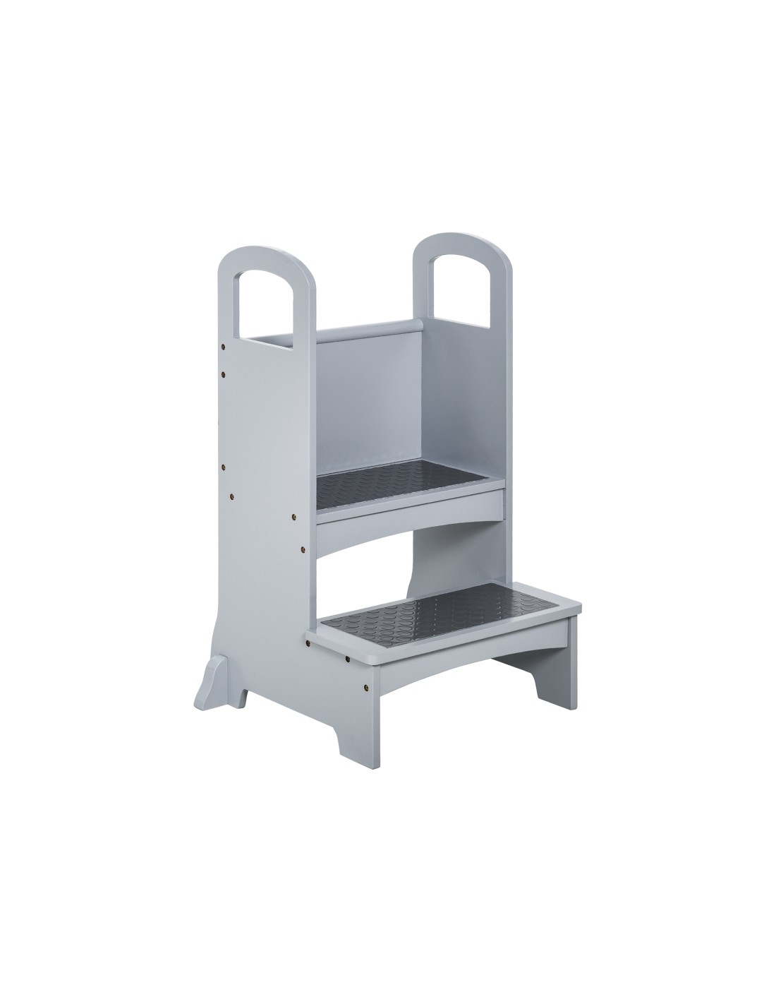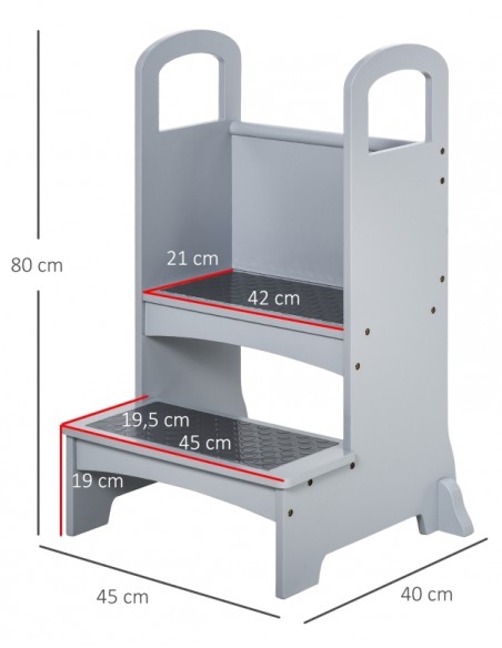 Læringstårn udført i et design af grålakeret fyrretræ og MDF, og med anti-skrid måtter på trinene. Læringstårnet måler 80 cm i højden og 45 x 40 cm i bredde og dybde.