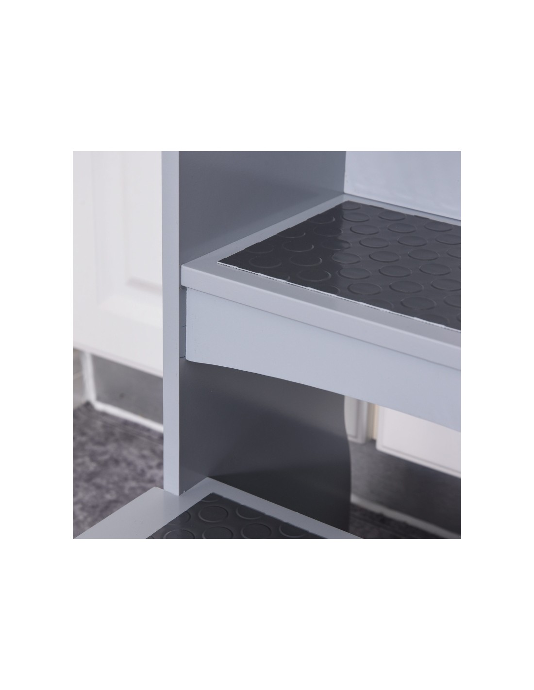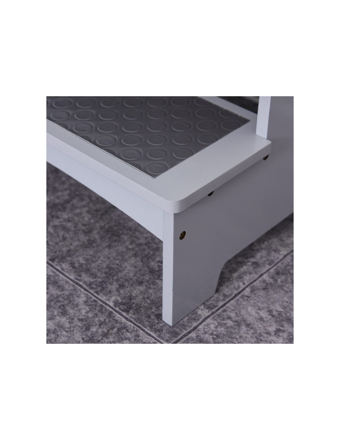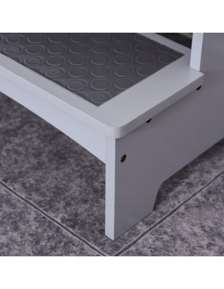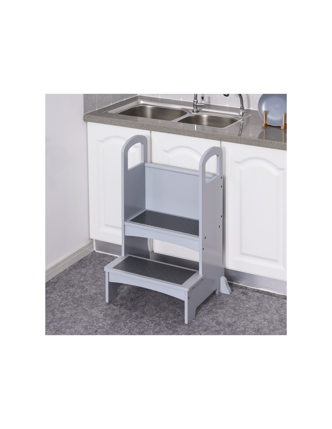 Læringstårn udført i et design af grålakeret fyrretræ og MDF, og med anti-skrid måtter på trinene. Læringstårnet måler 80 cm i højden og 45 x 40 cm i bredde og dybde.