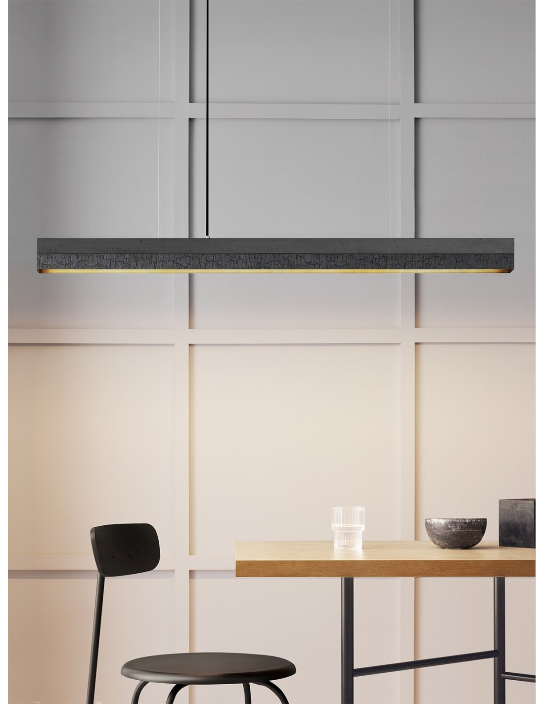 Langbordspendel i et moderne design fra GANTlights. Lampen måler 122 cm i længden og kommer med indbygget dæmpbar LED lyskilde på 25W. Lampen er fremstillet i rå mørk beton og brændt træ.