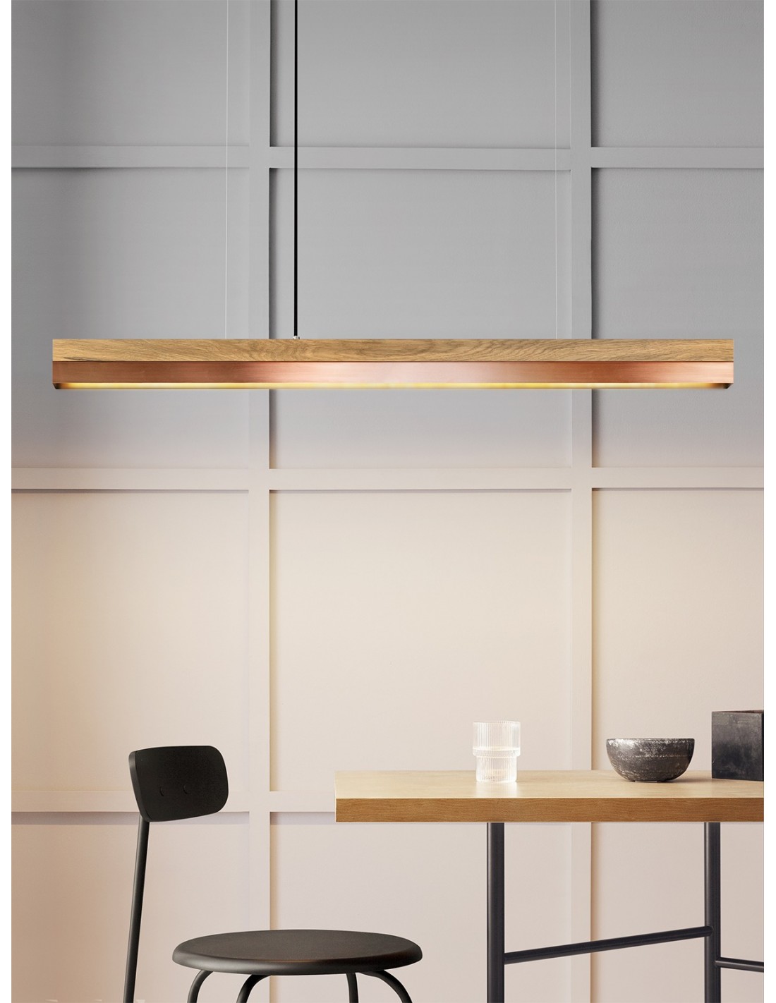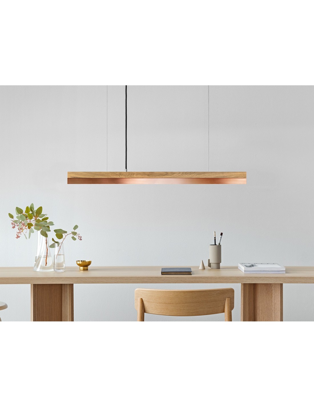 Langbordspendel i et moderne design fra GANTlights. Lampen måler 92 cm i længden og kommer med indbygget dæmpbar LED lyskilde på 25W. Lampen er fremstillet i egetræ og kobber.