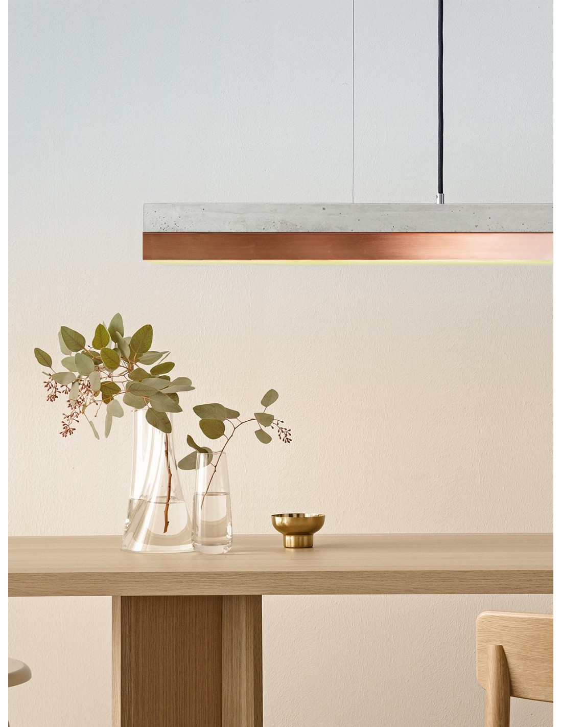 Langbordspendel i et moderne design fra GANTlights. Lampen måler 182 cm i længden og kommer med indbygget dæmpbar LED lyskilde på 25W. Lampen er fremstillet i rå lys beton og kobber.