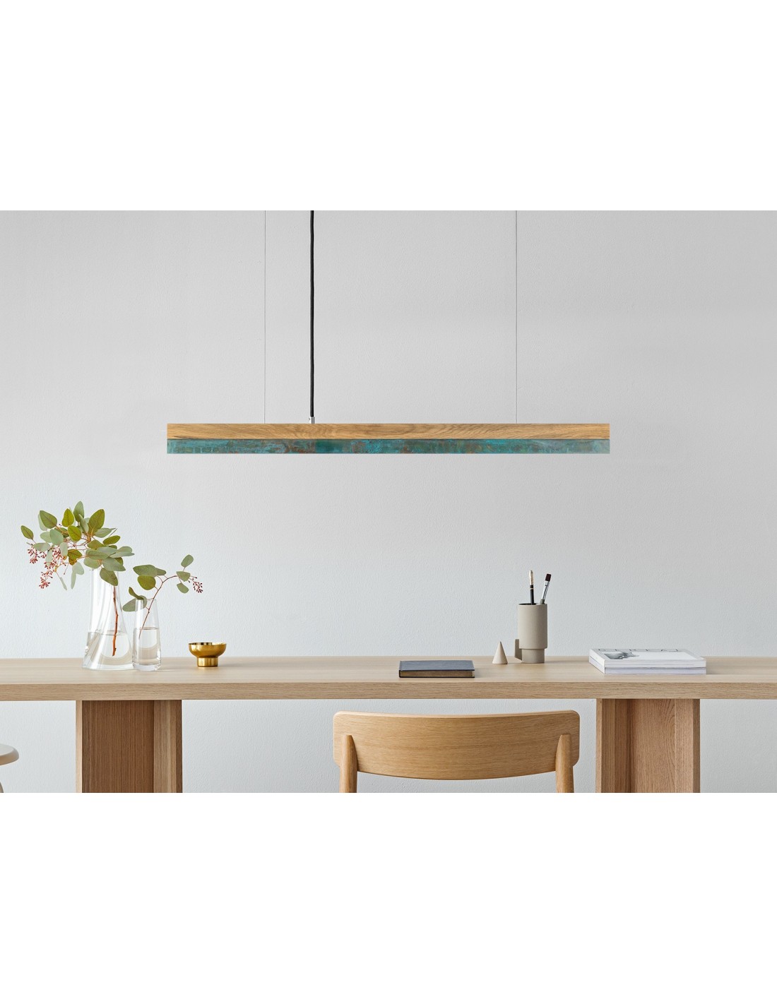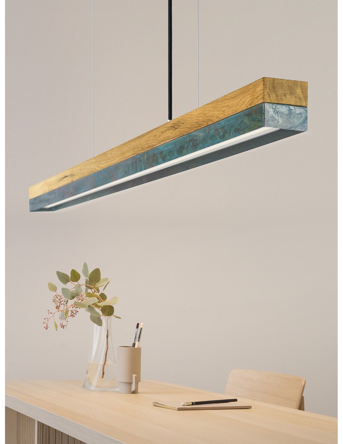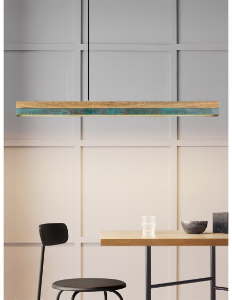Langbordspendel i et moderne design fra GANTlights. Lampen måler 92 cm i længden og kommer med indbygget dæmpbar LED lyskilde på 25W. Lampen er fremstillet i egetræ og oxideret kobber.