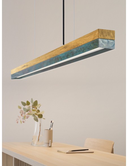 Langbordspendel i et moderne design fra GANTlights. Lampen måler 182 cm i længden og kommer med indbygget dæmpbar LED lyskilde på 25W. Lampen er fremstillet i egetræ og oxideret kobber.