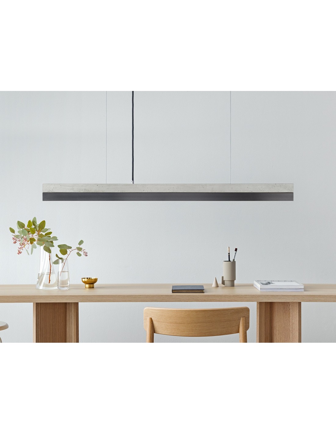 Langbordspendel i et moderne design fra GANTlights. Lampen måler 122 cm i længden og kommer med indbygget dæmpbar LED lyskilde på 25W. Lampen er fremstillet i rå lys beton og gunmetal lakeret stål.