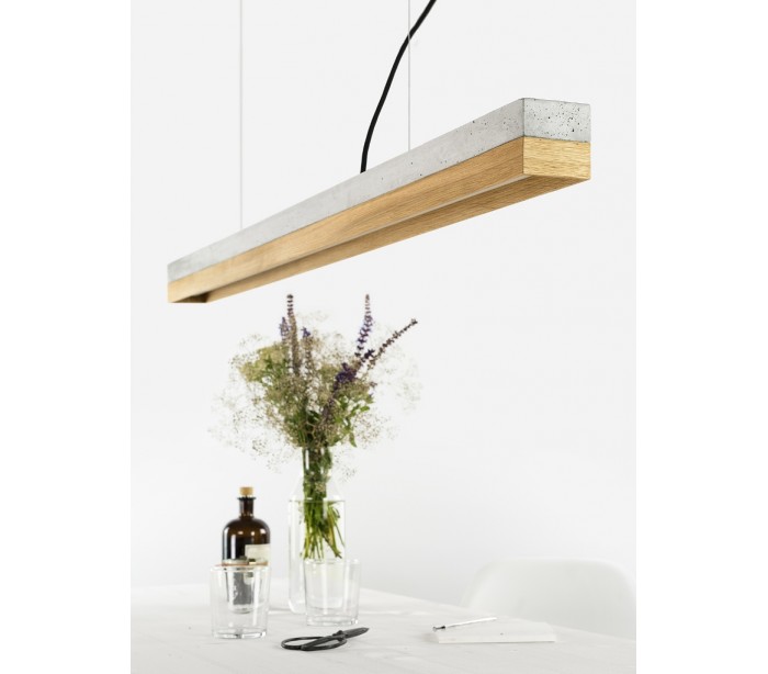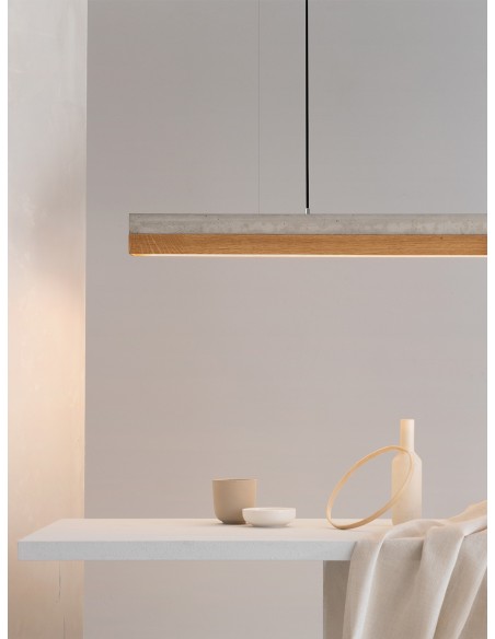 Langbordspendel i et moderne design fra GANTlights. Lampen måler 122 cm i længden og kommer med indbygget dæmpbar LED lyskilde på 25W. Lampen er fremstillet i rå lys beton og egetræ.