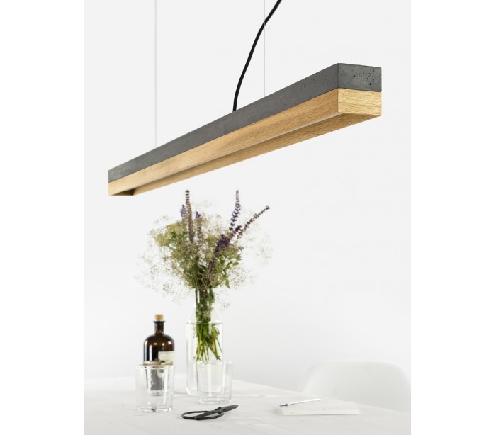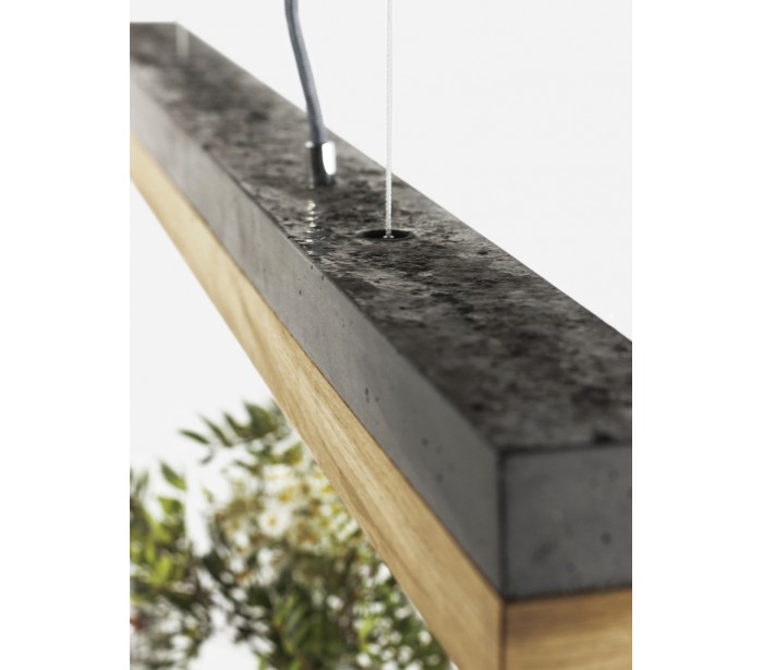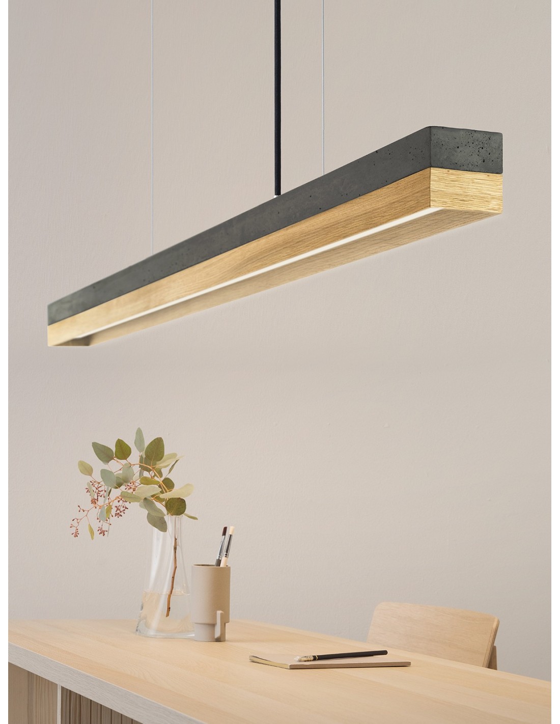 Langbordspendel i et moderne design fra GANTlights. Lampen måler 122 cm i længden og kommer med indbygget dæmpbar LED lyskilde på 25W. Lampen er fremstillet i rå mørk beton og egetræ.