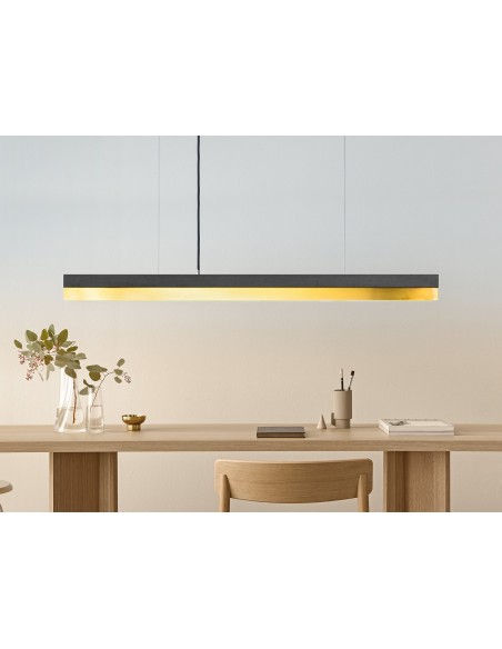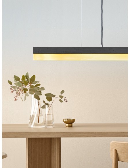 Langbordspendel i et moderne design fra GANTlights. Lampen måler 122 cm i længden og kommer med indbygget dæmpbar LED lyskilde på 25W. Lampen er fremstillet i rå mørk beton og messing.