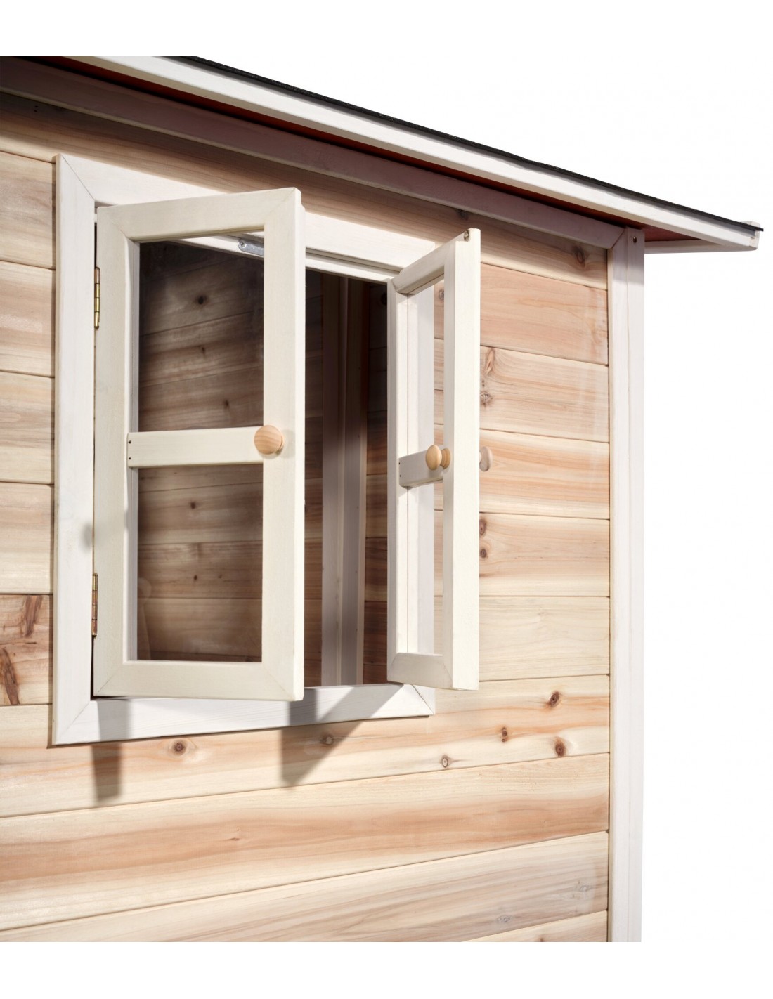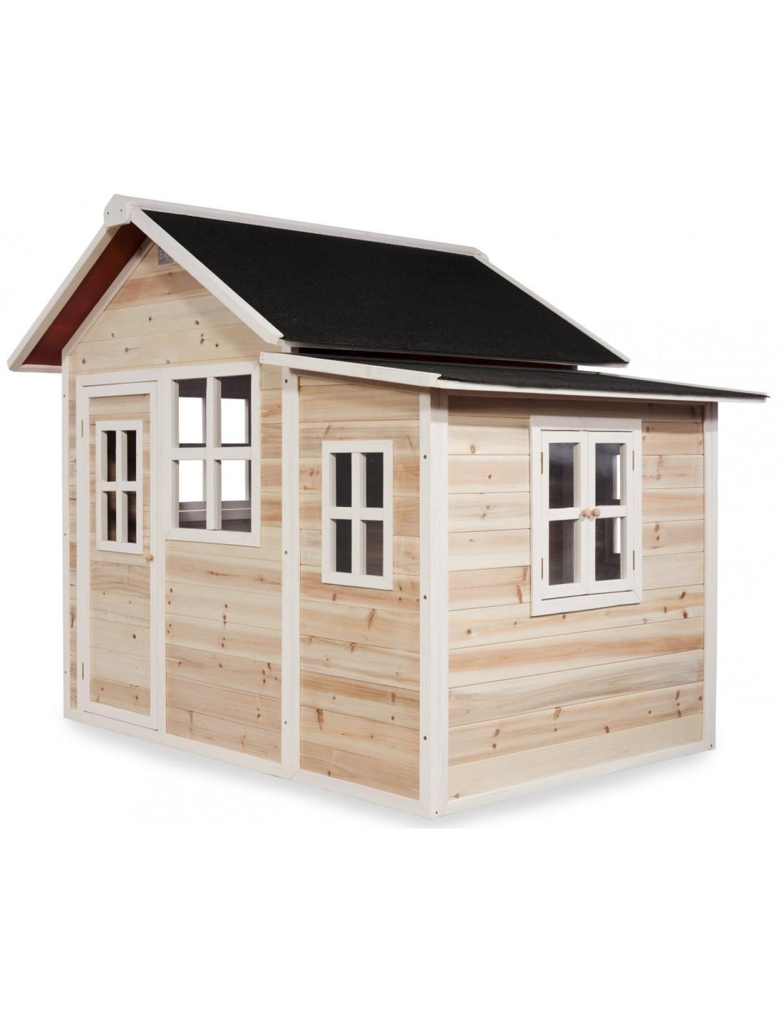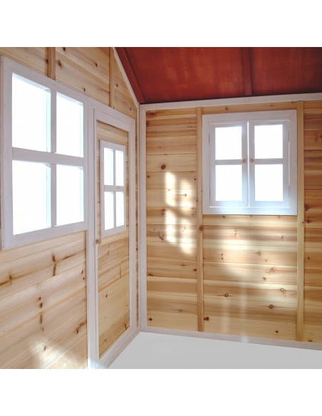 Legehus til børn, udført i et design af vejrbestandigt naturfarvet cedertræ. Legehuset måler 188 x 149 cm i bredde og dybde og 159 cm i højden. Legehuset leveres af præfabrikerede dele, der gør, at det er hurtigt at samle. Legehuset er vejrbestandigt takket være det vandtætte bitumentag, og det er lavet af FSC®-certificeret cedertræ (FSC 100 %, FSC® SCS-COC-007799). Denne type af træ splinter ikke og er naturligt modstandsdygtig over for vejrpåvirkninger såsom regn, og træet rådner derfor ikke så let. Legehuset kan selvfølgelig behandles løbende, men det er ikke nødvendigt at behandle legehuset før brug.