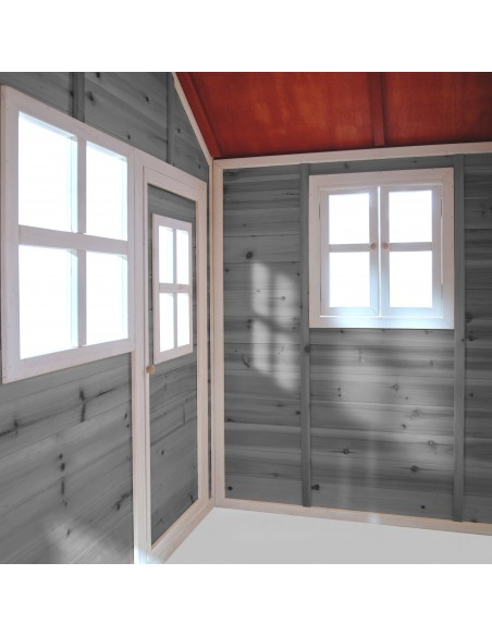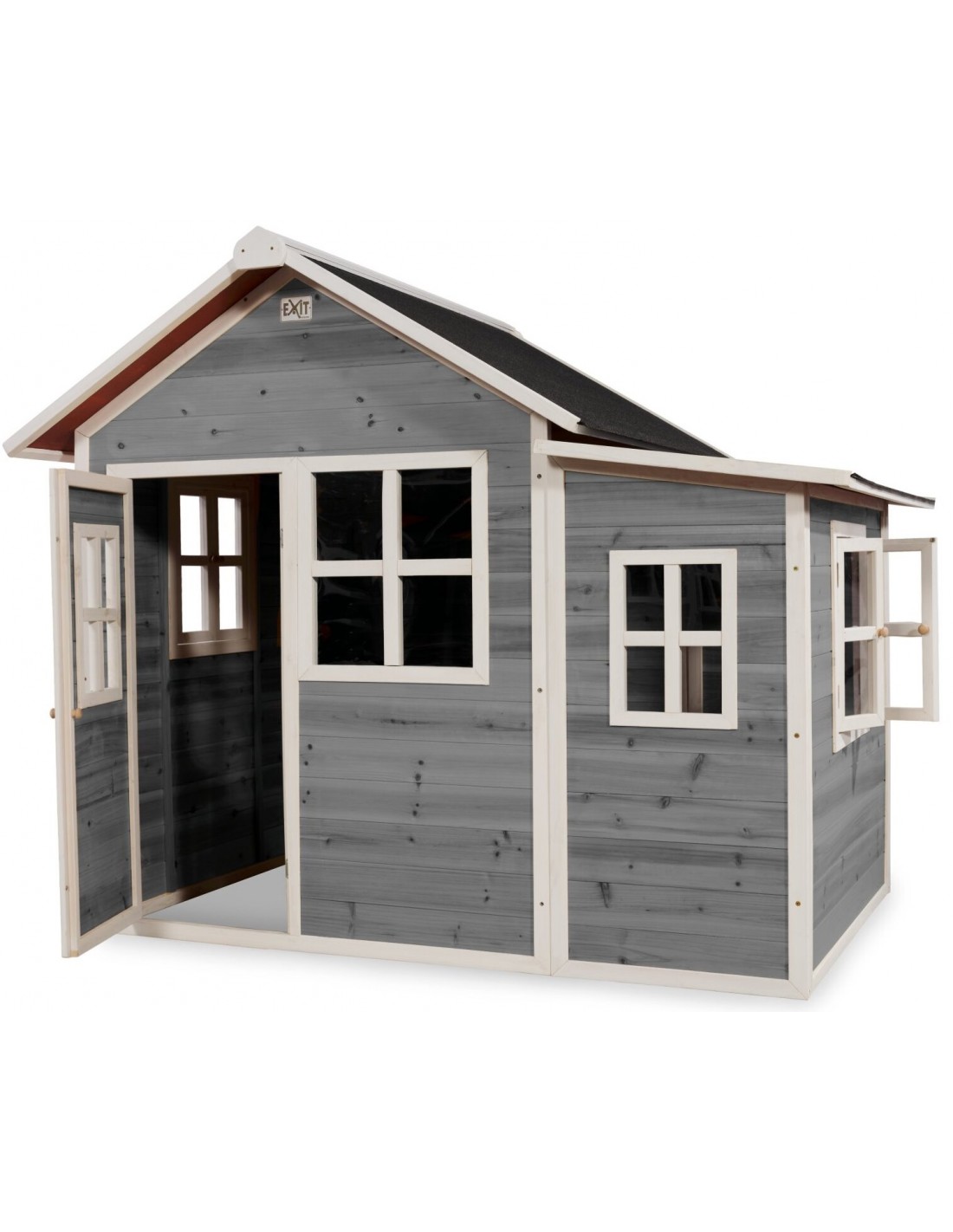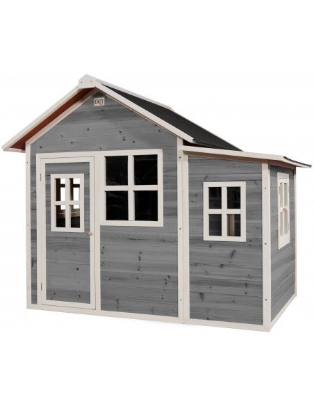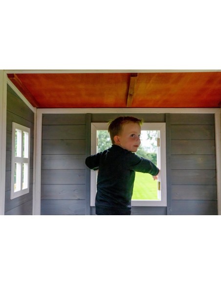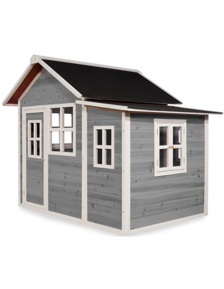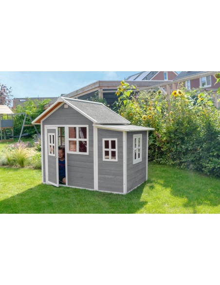Legehus til børn, udført i et design af vejrbestandigt grålakeret cedertræ. Legehuset måler 188 x 149 cm i bredde og dybde og 159 cm i højden. Legehuset leveres af præfabrikerede dele, der gør, at det er hurtigt at samle. Legehuset er vejrbestandigt takket være det vandtætte bitumentag, og det er lavet af FSC®-certificeret cedertræ (FSC 100 %, FSC® SCS-COC-007799). Denne type af træ splinter ikke og er naturligt modstandsdygtig over for vejrpåvirkninger såsom regn, og træet rådner derfor ikke så let. Legehuset kan selvfølgelig behandles løbende, men det er ikke nødvendigt at behandle legehuset før brug.