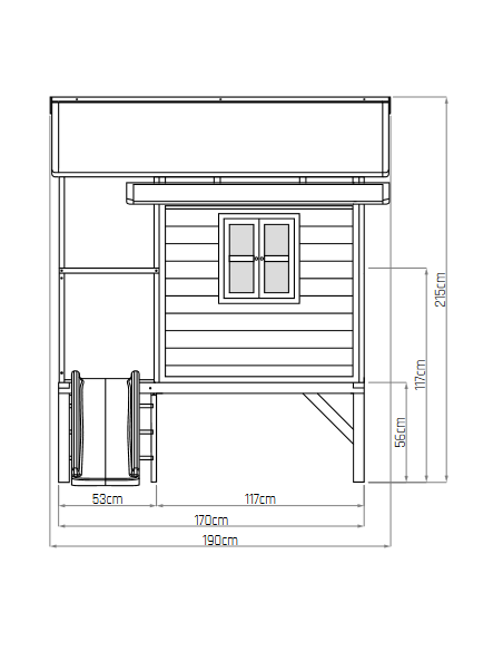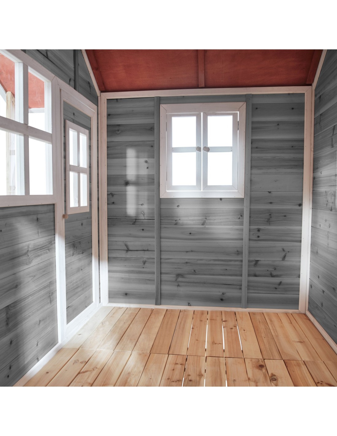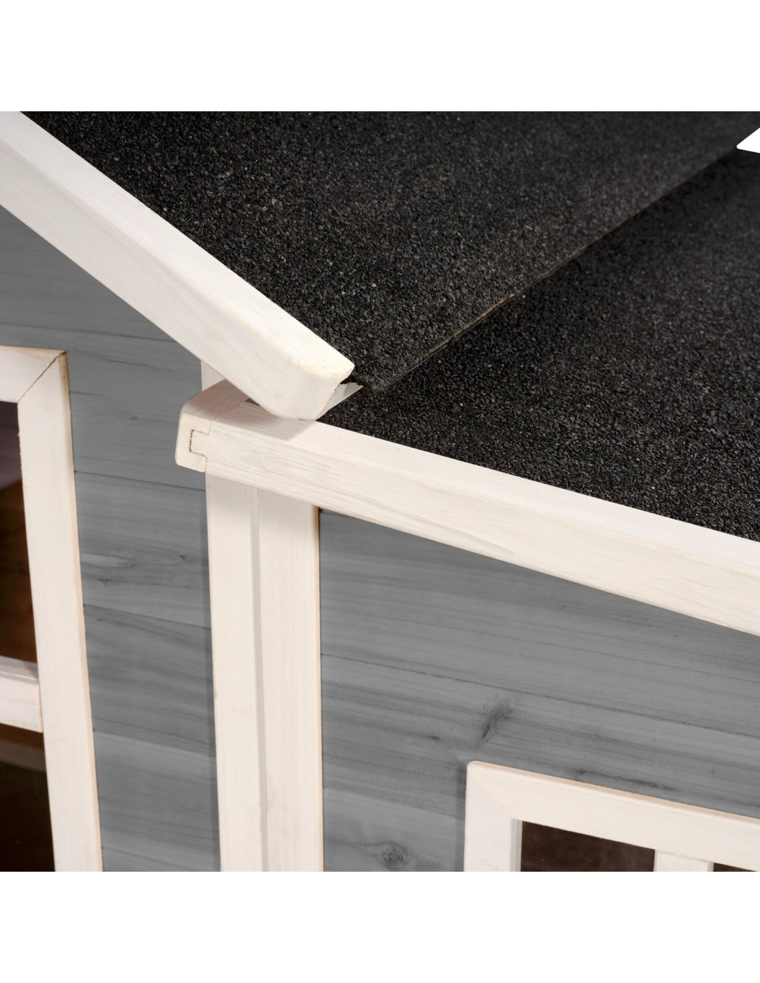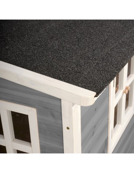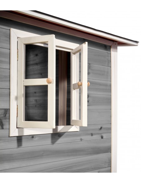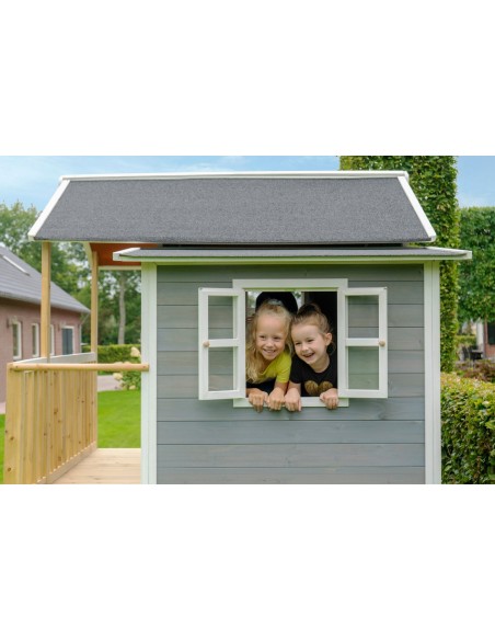 Legehus til børn, udført i et design af vejrbestandigt grålakeret cedertræ. Legehuset måler 322 x 190 cm i bredde og dybde og 215 cm i højden. Legehuset leveres af præfabrikerede dele, der gør, at det er hurtigt at samle. Legehuset er vejrbestandigt takket være det vandtætte bitumentag, og det er lavet af FSC®-certificeret cedertræ (FSC 100 %, FSC® SCS-COC-007799). Denne type af træ splinter ikke og er naturligt modstandsdygtig over for vejrpåvirkninger såsom regn, og træet rådner derfor ikke så let. Legehuset kan selvfølgelig behandles løbende, men det er ikke nødvendigt at behandle legehuset før brug.