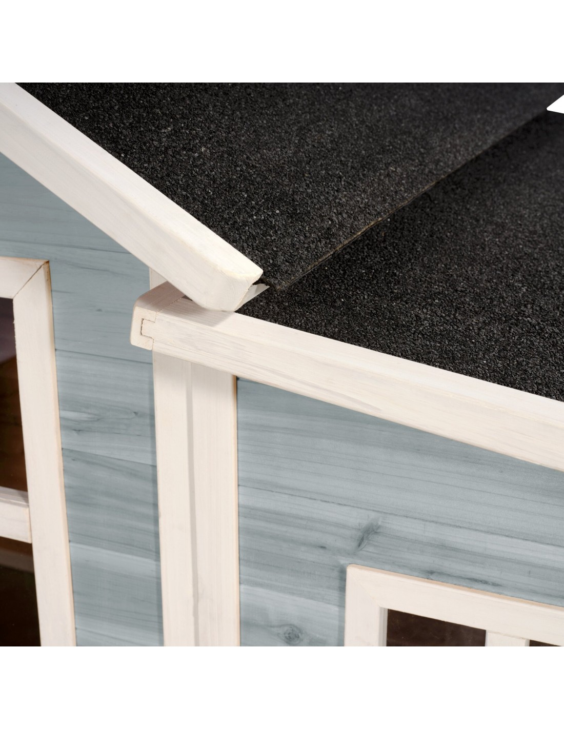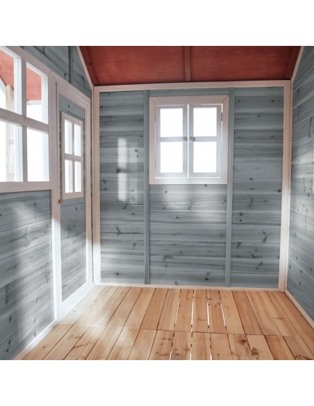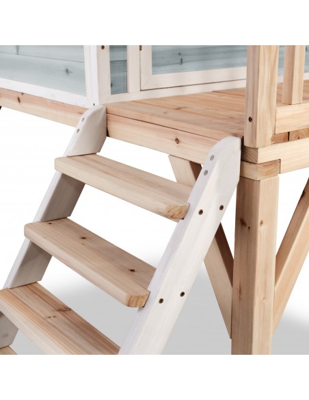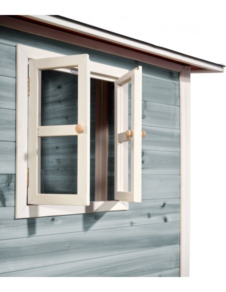 Legehus til børn, udført i et design af vejrbestandigt blålakeret cedertræ. Legehuset måler 322 x 190 cm i bredde og dybde og 215 cm i højden. Legehuset leveres af præfabrikerede dele, der gør, at det er hurtigt at samle. Legehuset er vejrbestandigt takket være det vandtætte bitumentag, og det er lavet af FSC®-certificeret cedertræ (FSC 100 %, FSC® SCS-COC-007799). Denne type af træ splinter ikke og er naturligt modstandsdygtig over for vejrpåvirkninger såsom regn, og træet rådner derfor ikke så let. Legehuset kan selvfølgelig behandles løbende, men det er ikke nødvendigt at behandle legehuset før brug.