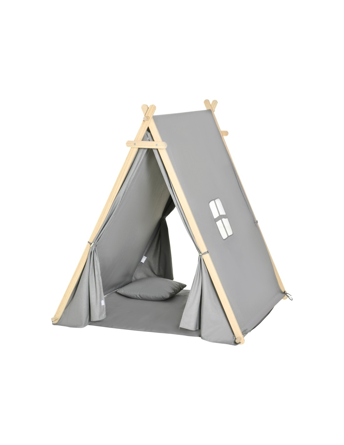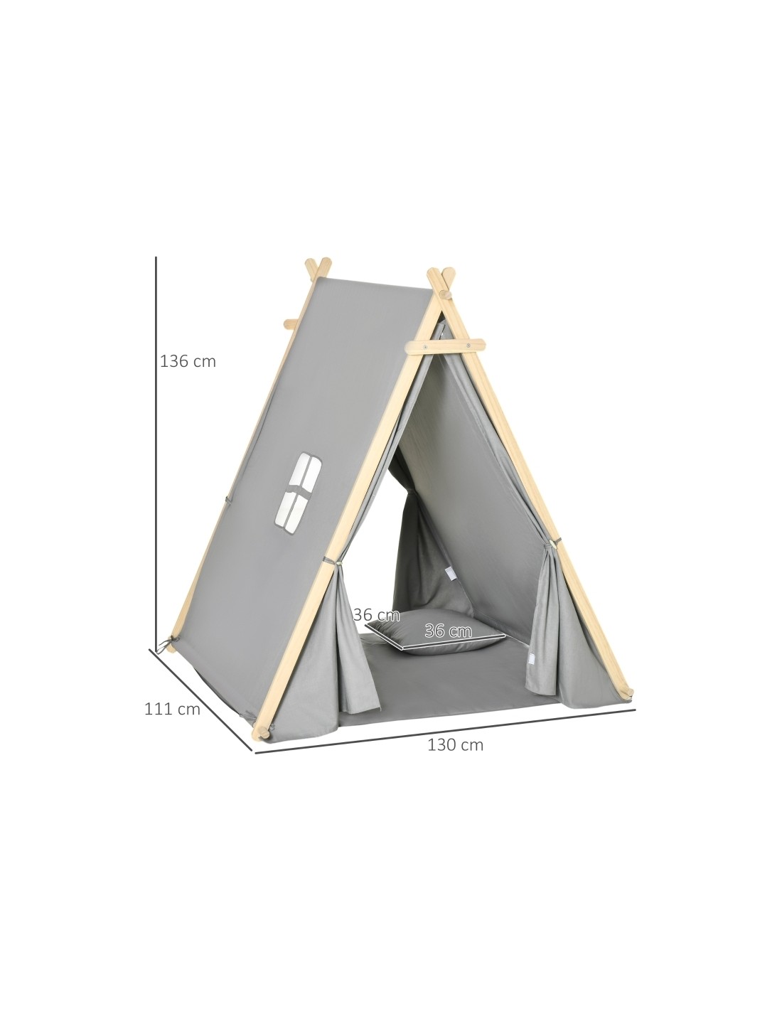 Legetelt til børn, udført i et design af træ og tekstil. Teltet kan anvendes både udendørs såvel som indendørs, men bør ikke udsættes for regn eller fugt. Teltet måler 136 cm i højden og 130 x 111 cm i bredde og dybde.