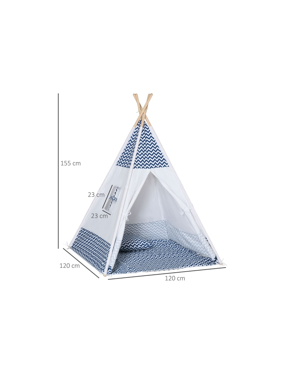 Legetelt til børn, udført i et design af træ og tekstil. Teltet kan anvendes både udendørs såvel som indendørs, men bør ikke udsættes for regn eller fugt. Teltet måler 155 cm i højden og 120 cm i bredde og dybde.