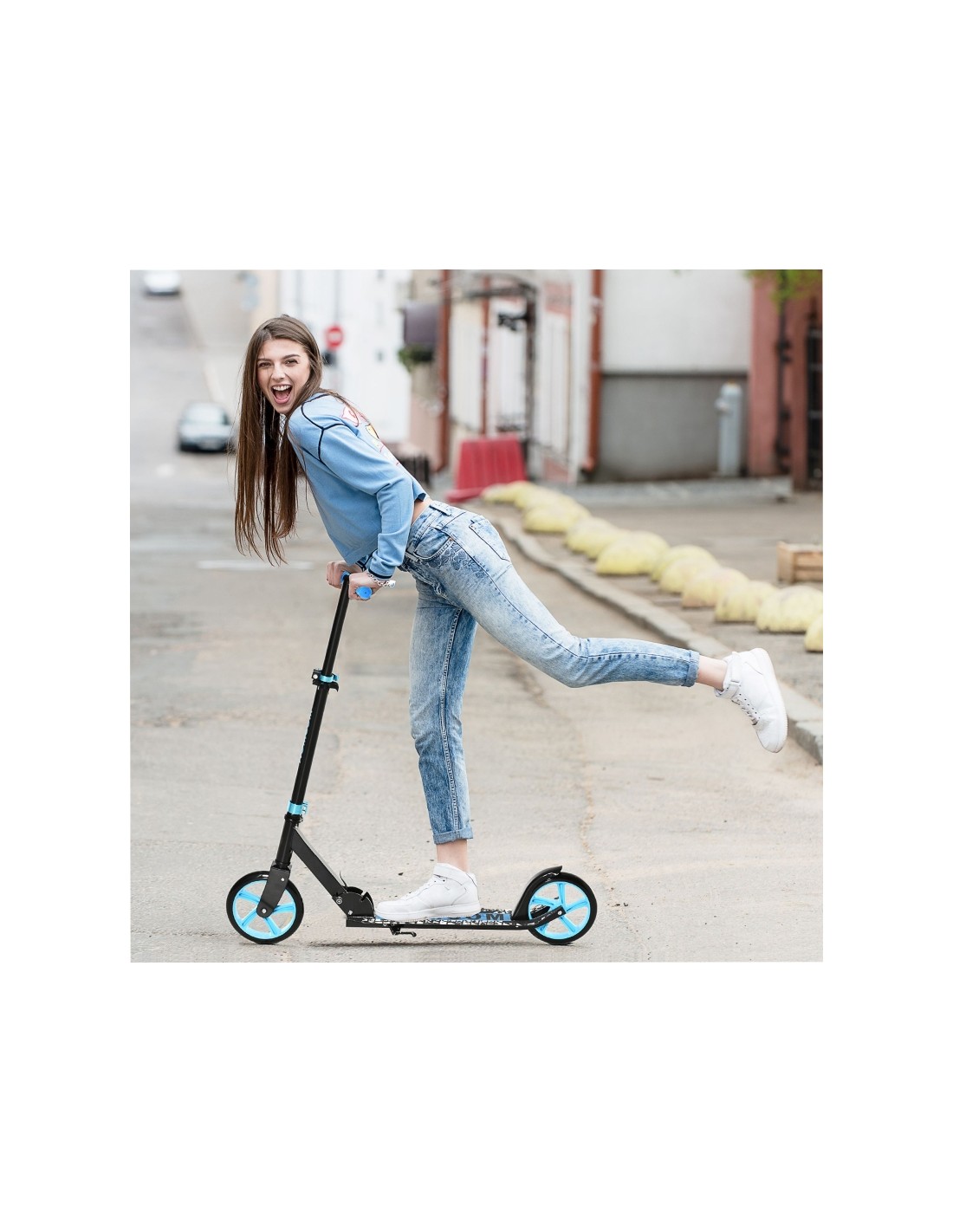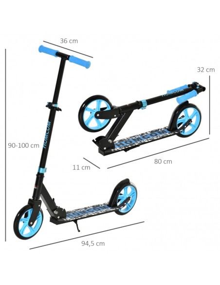 Løbehjul til børn, udført i et design af blå og sort metal og kunststof med hjul i PU. Løbehjulet måler 94,5 cm i længden og passer til personer mellem 130 - 180 cm i højden.