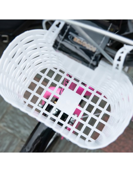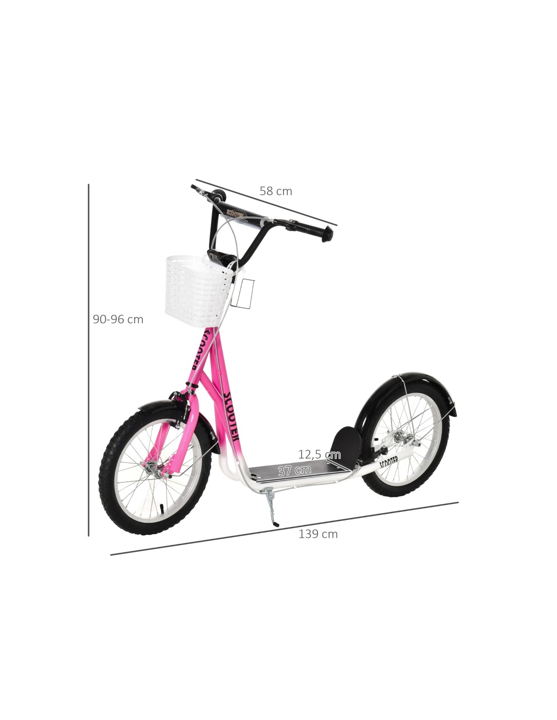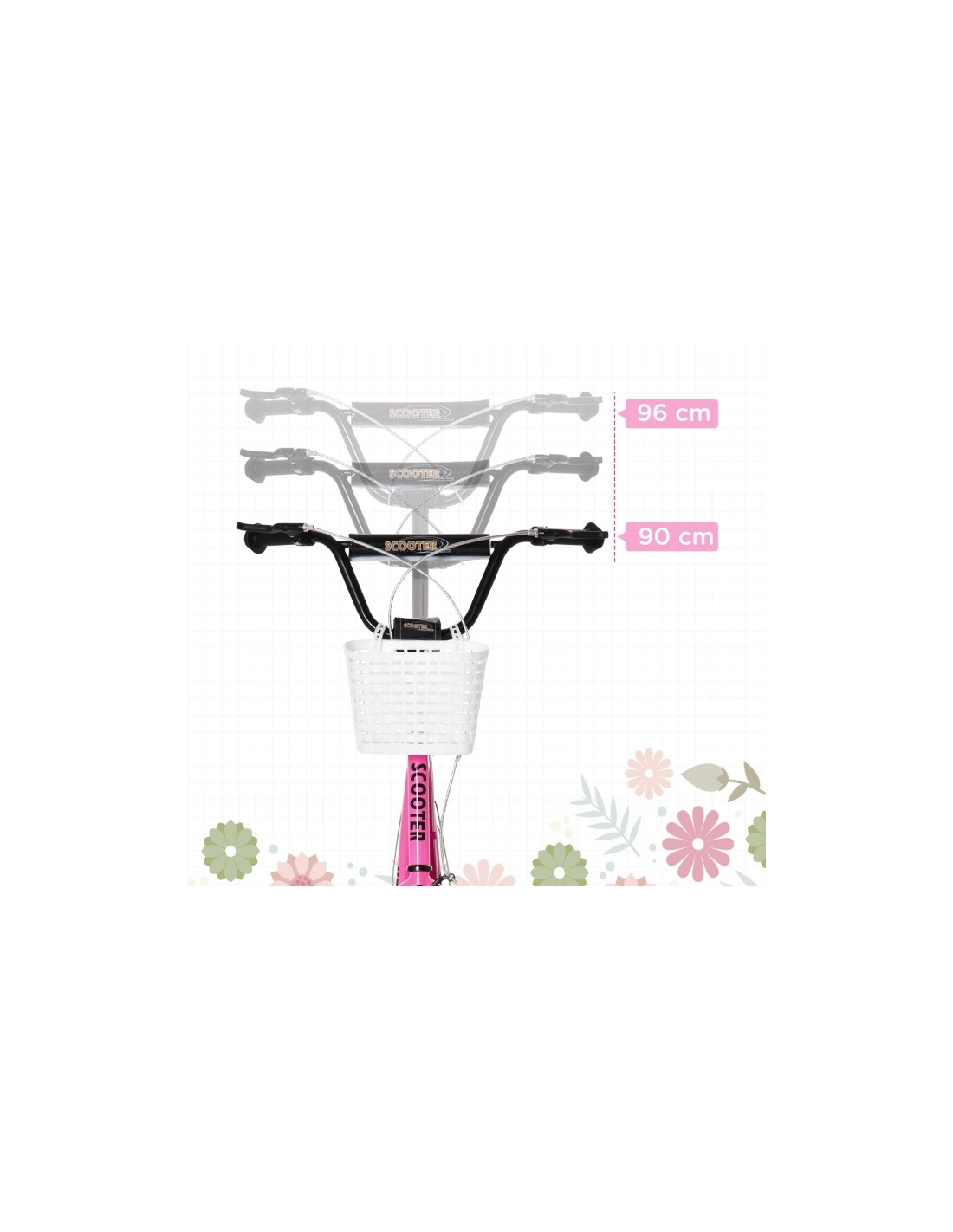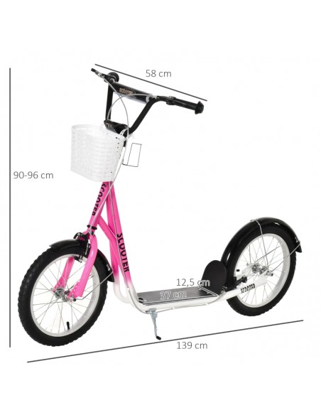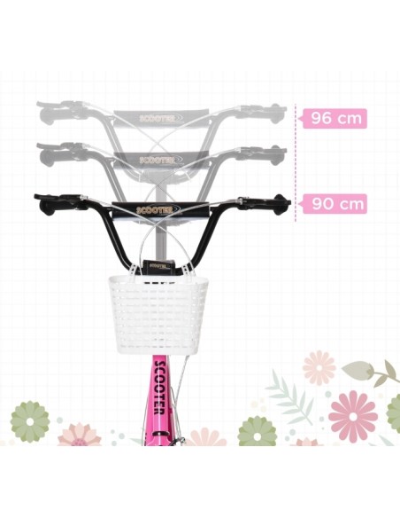 Løbehjul til børn, udført i et design af sort og rosa metal og kunststof med hjul i gummi. Løbehjulet måler 139 cm i længden og passer til børn i alderen 5 - 12 år.