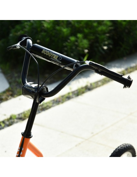 Løbehjul til børn, udført i et design af sort og orange metal og kunststof med hjul i gummi. Løbehjulet måler 135 cm i længden og passer til børn fra 5 år.