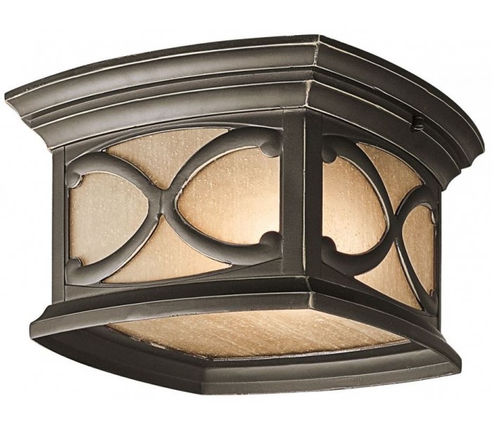Franceasi udendørs loftlampe i et rustikt design fra amerikanske Kichler. Loftlampen leveres til europæisk standard til 2 x E27 lyskilder. Lampen måler 27,9 cm i bredde og dybde og 16,5 cm i højde/fremspring.