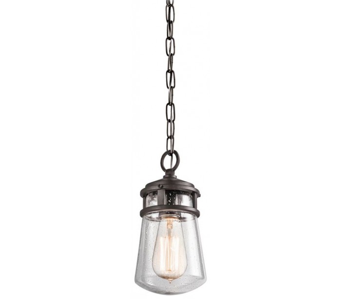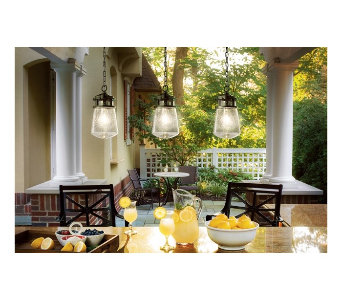 Lyndon udendørs hængelanterne i et rustikt design fra amerikanske Kichler. Væglampen leveres til europæisk standard til 1 x E27 lyskilde. Lampen måler 12,7 cm i diameter og 29,4 - 128 cm i højden.