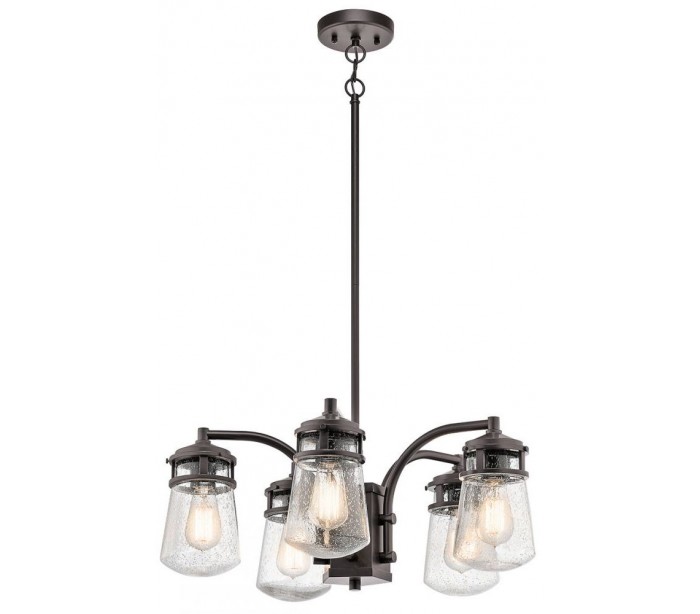 Lyndon udendørs lysekrone i et rustikt design fra amerikanske Kichler. Væglampen leveres til europæisk standard til 5 x E27 lyskilde. Lampen måler 61 cm i diameter og 30,5 - 121,9 cm i højden.