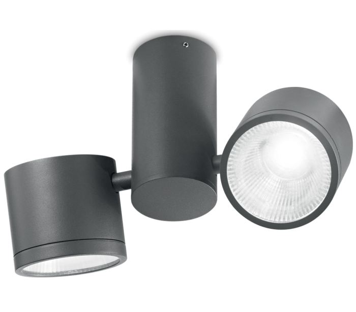 SUNGLASSES udendørs påbygningsspot i et moderne design fremstillet i antracit lakeret aluminium. Spotten måler 15 cm i højden og anvender 2 x 14W LED lyskilder (Inkl.). Lampehovederne er justerbare.