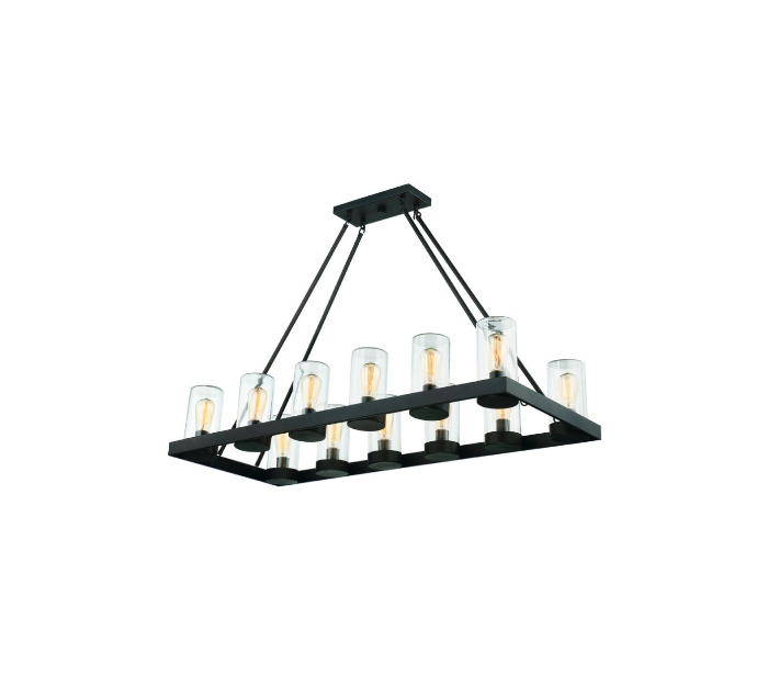 Inman 12 loftlampe udført i et design af antik bronzelakeret metal og klart glas. Lampen er fra amerikanske Savoy House og anvender 12 x E27 lyskilder og måler 76 cm i højden og 114 x 48 cm i bredde og dybde.