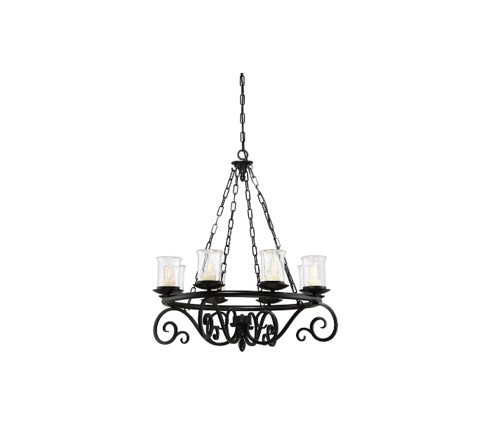 Welch 8 udendørs lysekrone udført i et design af mat sortlakeret metal og klart glas med dråbe effekt. Lampen er fra amerikanske Savoy House og anvender 8 x E14 lyskilder og måler 85 - 370 cm i højden og 81 cm i diameter.
