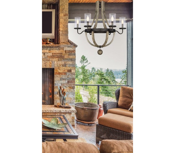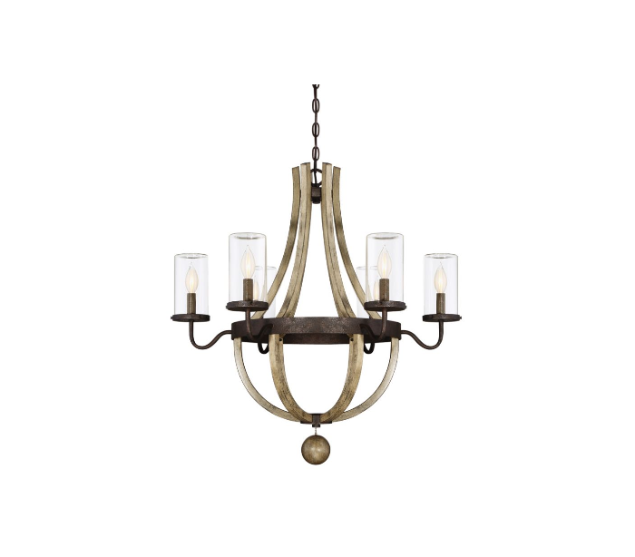 Eden 6 udendørs lysekrone udført i et design af antik rustlakeret metal, rustik naturfarvet træ og klart glas. Lampen er fra amerikanske Savoy House og anvender 6 x E14 lyskilder og måler 77 - 370 cm i højden og 74 cm i diameter.